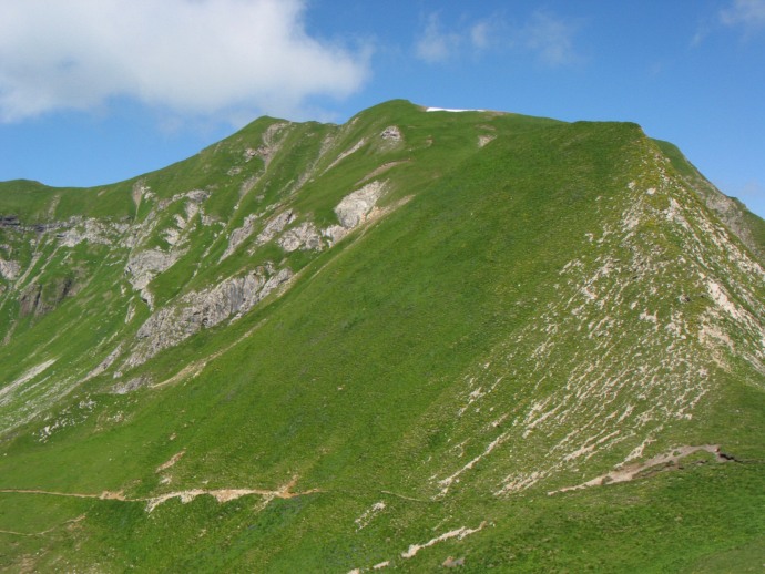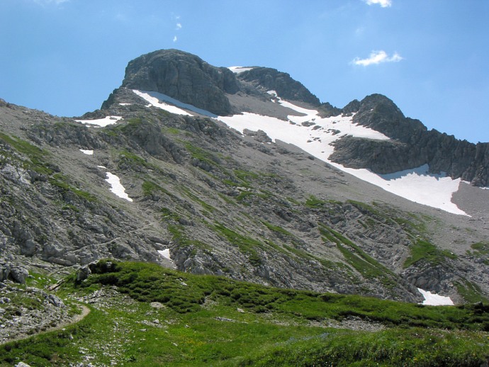 Zunächst führt der Weg entlang eines Almweges in die Höhe. Kurz darauf entledige ich mich an einer Bank der überschüssigen Kleidung. Zweihundert Höhenmeter später bemerke ich, dass sich bei dieser Gelegenheit mein Höhenmesser vom Handgelenk gelöst haben muss. Da hinter mir eine Familie gegangen ist, hoffe ich, dass sie vielleicht die Uhr gefunden haben; aber nach halbstündigem Warten sehe ich sie immer noch weit unten, gebe es schließlich auf und sehe den Verlust als ein Opfer an die Berge an.