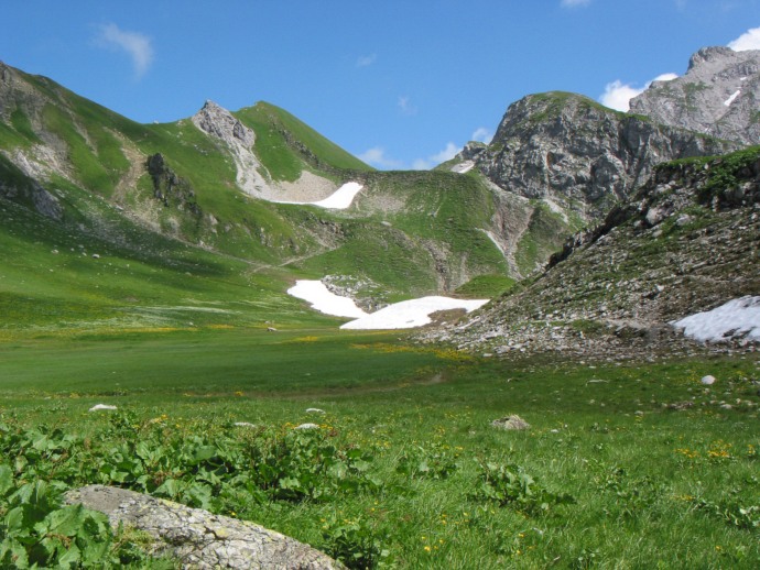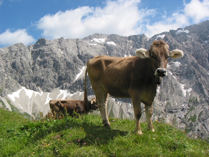 Langsam kommt das erste Teilziel näher. Nachdem es lange Zeit auf Wiesen mit saftigen Weiden langsam bergan gegangen ist, kommt nun das Talende in Sicht. Dahinter die Braunarlspitze.