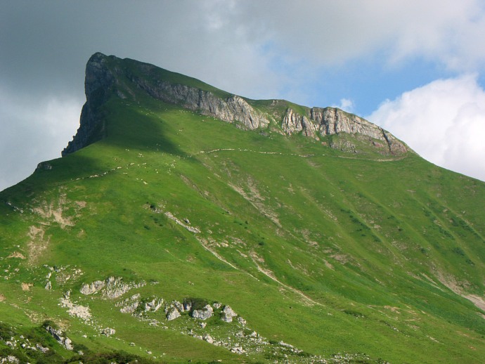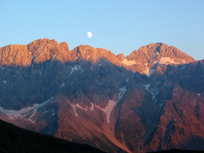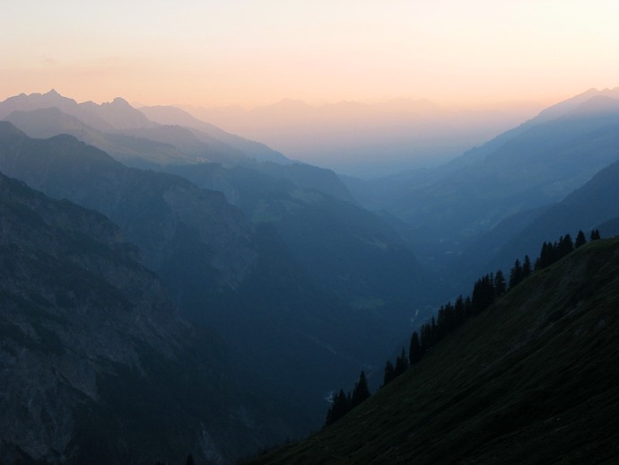 Langsam wird es Abend. Unter dem Rothorn sammeln sich weiße Punkte am hochgelegenen Pfad und erweisen sich schließlich als eine Schafherde, die zu ihrem nächtlichen Quartier aufbricht.