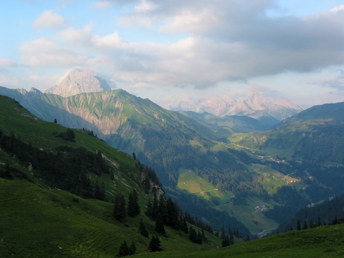Widderstein im Abendlicht und die Pass-Straße nach Lech.