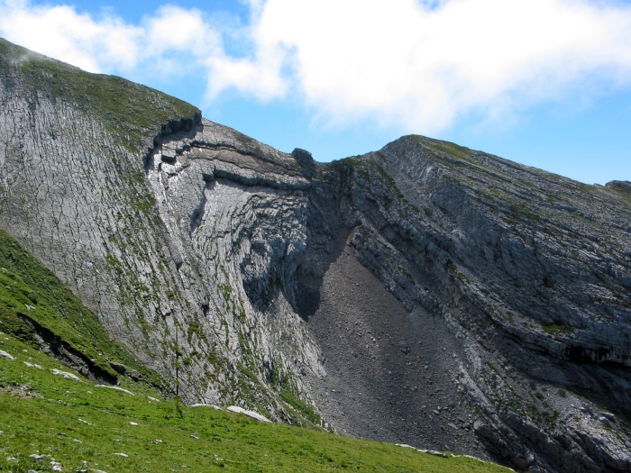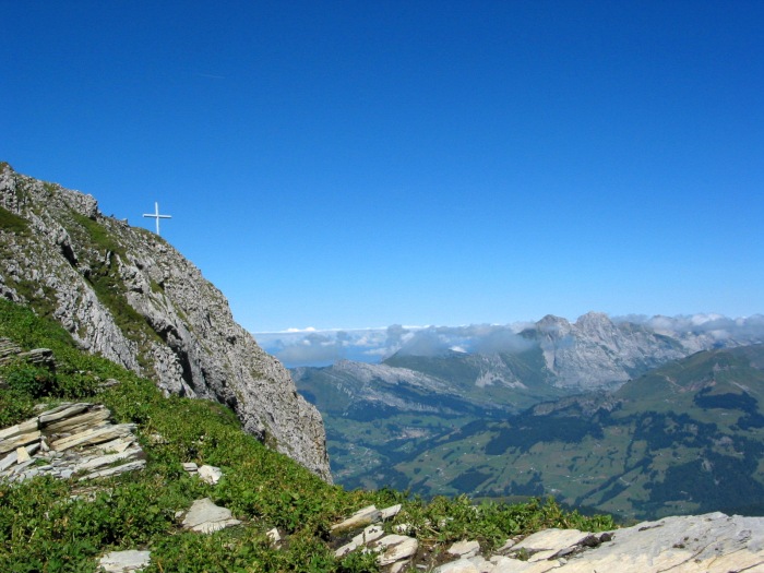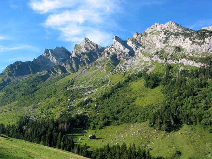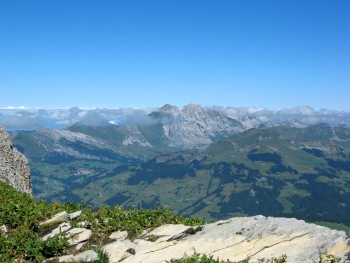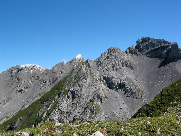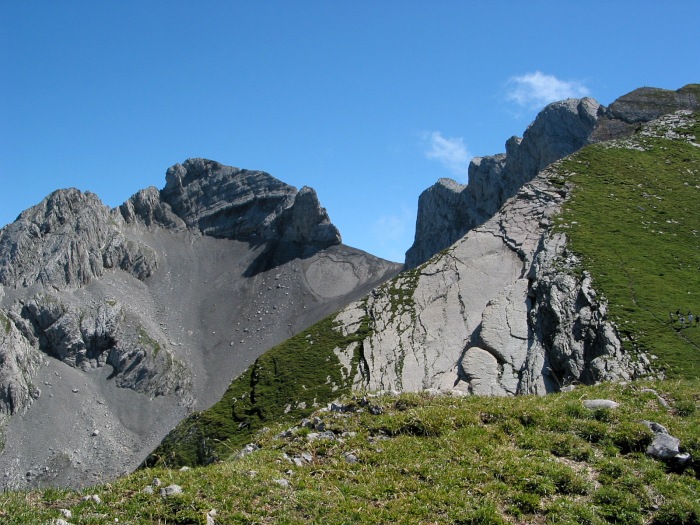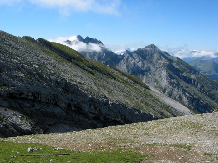 Beim weiteren Aufstieg werden die dahinter liegenden, noch höheren Berge (auch wenn es auf dem Bild nicht so aussieht - die Perspektive täuscht) sichtbar, der höchste davon der La Grande Palmaz mit einer Schnee-bepuderten (Speer-)Spitze