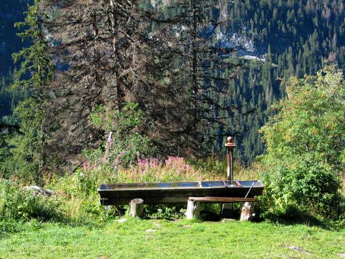 Weiter geht es nun per Auto zum nächsten Tourenziel, das an der Westflanke der Chaine des Aravis liegt. Über Thônes geht es in ein Seitentälchen, das zu dieser Jahreszeit schon fast wie ausgestorben wirkt. Schon befürchte ich, kein Nachtquartier mehr zu bekommen, da findet sich bei La Perriere endlich ein Hinweisschild auf einen Campingplatz. Der Wirt ist ein älterer französicher Landwirt, der den Campingplatz auf seinem Bauerhof eingerichtet hat. Was selten ist: Über dem zum Waschraum umgebauten Schuppen, hat er den Dachboden zu einem Picknick-Saal umgebaut, so dass auch an feuchten Tagen ein trockenes Plätzchen zur Verfügung steht. Von seinem selbstgemachten Honig nehme ich ihm auch noch einen Eimer ab.