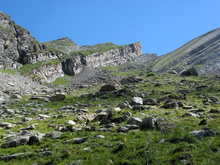 Mühsam geht es nun weiter aufwärts. Die Wegekennzeichnung ist hier eher dürftig, so dass zur Orientierung eine gute Karte sehr angebracht ist. Instinktiv nehme ich den Weg, der mir an der rechten Bergflanke bis zum Talende zu führen scheint. Schon bald erkenne ich aber auch hier meinen Irrtum, denn der Pfad biegt nach kurzem Anstieg ab und führt wohl an die Kante, wo die Via ferrata endet. So geht es wieder einmal über Stock und Stein zurück, bis ich wieder auf einen gut sichtbaren Weg stoße.