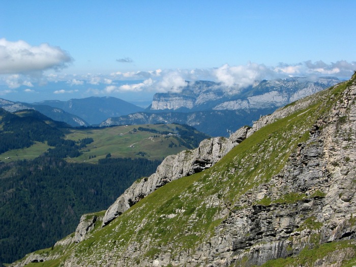 Blick hinüber zur nächsten Bergkette im Westen. Dahinter liegt Annecy und die Rhone-Ebene.