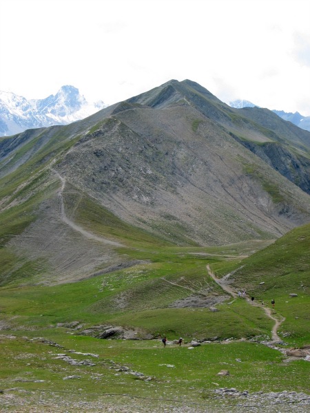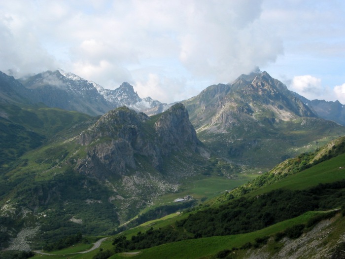 Blick zurück. Im Vordergrund ist ein Teil der Passstraße zu sehen. Bei dem Bergmassiv handelt es sich um die Berge östlich vom Stausee, die (scheinbar)höchste Erhebung davon (in Wolken) ist der 2 889 hohe Aig. du Grande Fond, links davon und nur getrennt durch den Col du Grande Fond der mit 2 974 m noch etwas höhere Pnte de la Combe Nueve. Vergleiche auch die Wanderung 2003 - Vanoise.