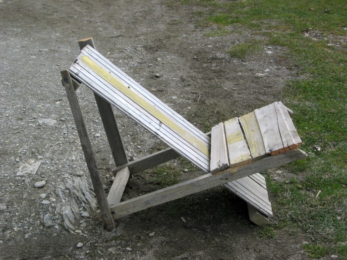 Schon von weit unten hatte man die bewirtschaftete Hütte auf einem leichten Vorsprung sitzen sehen. Es dauerte allerdings unglaublich lange, fast 2 Stunden, bis die ca. 600 m höher gelegene Hütte erreicht war. Etwas eigentümlich, aber praktisch und umweltfreundlich sind die Liegestühle vor der Hütte. Der Autor verzichtete auf einen Sitz- und Bequemlichkeitstest.