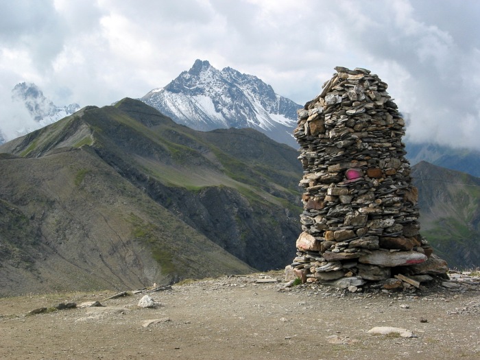 Letztes Jahr hatte ich diese Gegend bis fast zum Col du Bonhomme von der Nordseite aus bestiegen und so bot sich in diesem Jahr die Gelegenheit, das fehlende Teilstück noch von Süden aus zu erwandern. Dazu geht es noch einige Höhenmeter weiter bis zum Croix du Bonhomme mit dem obligatorischen Steinhaufen als Orientierungshilfe.