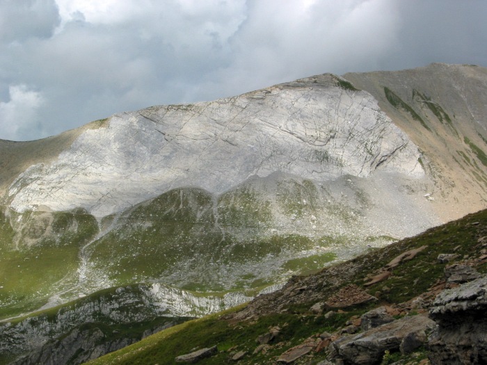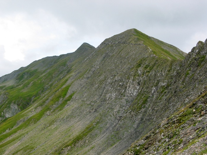 Die Serpentine kürze ich ab, indem ich einfach den Hang erklimme. Auch andere hatten wohl schon die selbe Idee, denn nach wenigen Schritten stoße ich auf einen gut ausgetretenen Trampelpfad. Von hier aus erhasche ich auch noch eine Blick auf den heute Nachmittag erwanderten Kamm, diesmal allerdings von der harmloseren, mit Gras bewachsenen Südseite aus.