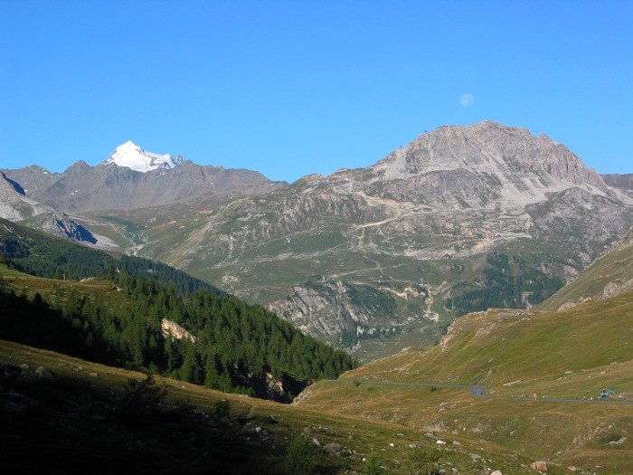 Der fast volle Mond steht noch im Westen hoch über dem Rocher de Bellevarde und daneben glänzt die weiße Eiskappe des Grande Motte.