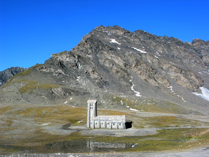 Das Kirchlein am Col de l´Iseran, dahinter der 3 041 m hohe Pointe des Lessières.