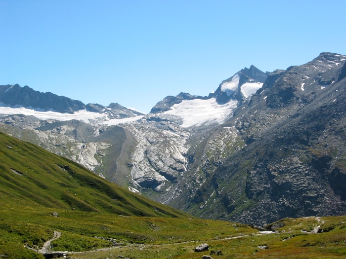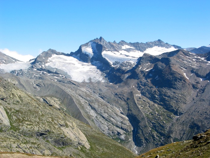 Der Blick streift hinüber zur Gletscherwelt (Glacier des Sources de l´Arc). Dass der Gletscher in früheren Zeiten wesentlich weiternach unten gereicht haben muss, zeigen die beiden riesigen Seitenmoränen, die der nach unten drängende Gletscher, d.h. seine Zunge, seitlich abgelagert hat.