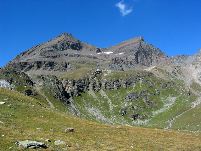 Der 3 081 m hohe Spitz des Ouille de Reys, an dessen Flanke der Rückweg durch das obere Schotterfeld führen wird.