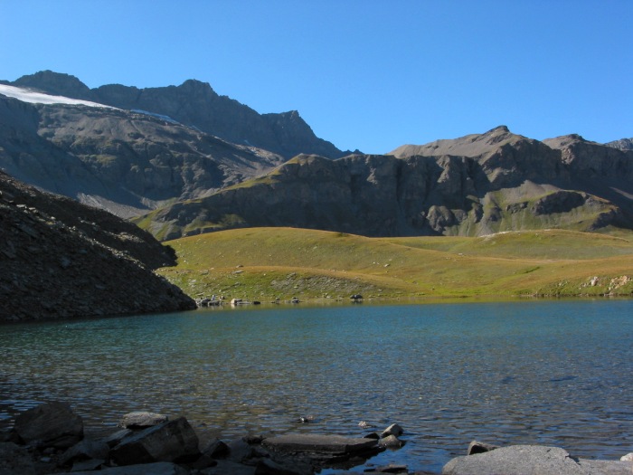 Links vom See als kleines "Holzklötzchen" die Refuge du Carro