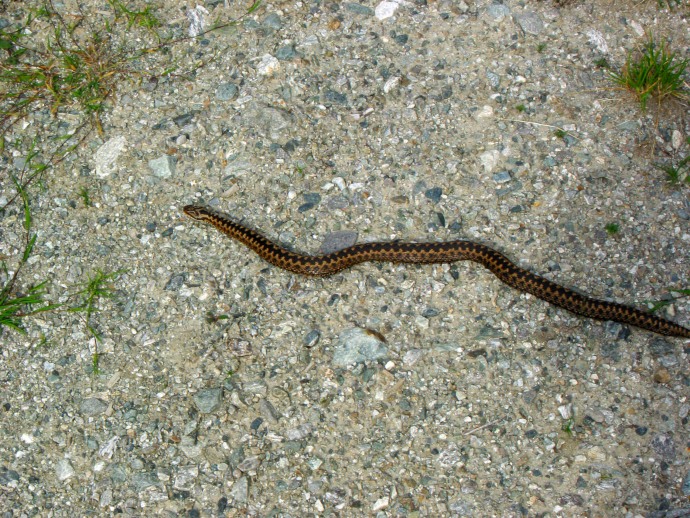 Kurz vor dem Fenggatobel läuft (oder eher kriecht) uns diese Kreuzotter über den Weg. Den Verhältnissen im feuchten und steilen Fenggatobel trauen wir nicht ganz und nehmen statt dessen das Sträßchen, das uns direkt zum Ausgangspunkt hinunter führt (d. h. es liegt noch eine kleine Zwischenstation mit Bierausschank dazwischen).
