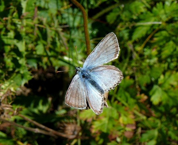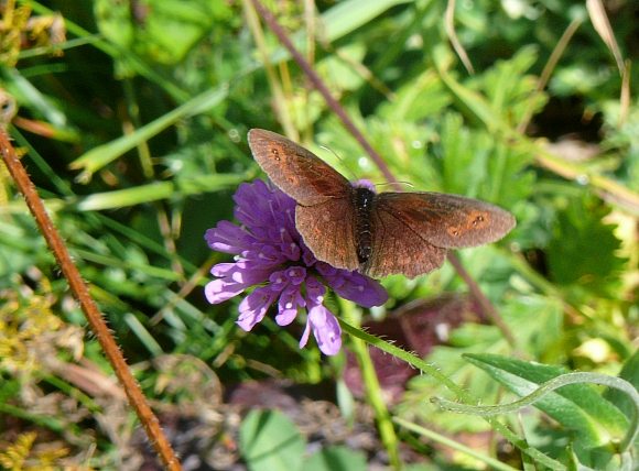 An einer Stelle am Waldesrand mache ich eine kleine Pause und entdecke, dass es sich um ein sehr abwechslungsreiches Habitat handelt, das wegen seiner Steile im Gegensatz zu den umliegenden Wiesen nicht gemäht wird. Eine Vielzahl von Pflanzen gedeiht, und das wirkt sich sofort auf die Artenvielfalt bei den Schmetterlingen aus. Hier lassen sich innerhalb weniger Minuten eine Vielzahl von Schmetterlingen, die ich leider nicht sicher identifizieren kann (Mohrenfalter ?), beobachten.