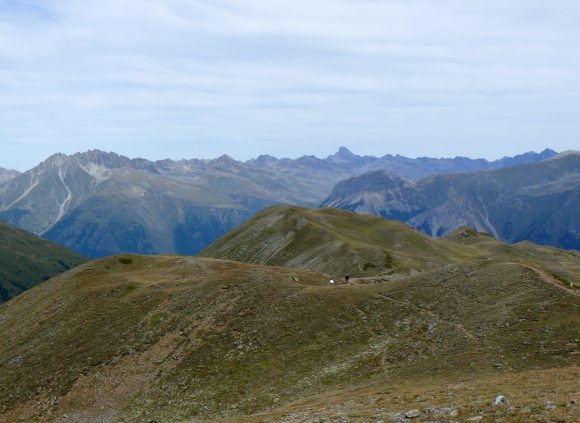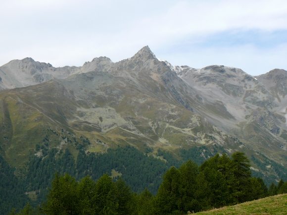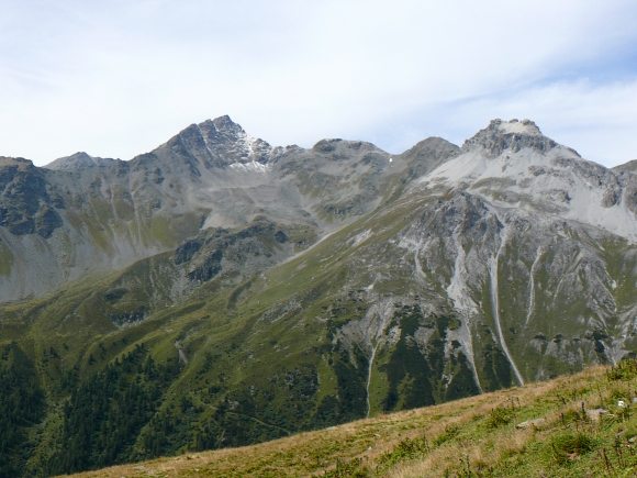 Blick nach Nordwesten zum Piz Sesvenna (links, 3129 m) und dem wegen seiner Schutthänge markante Föllakopf (rechts, 2878 m).