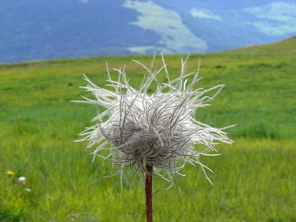 Eine verblühte Alpen-Küchenschelle innerhalb der Schutzzone zieht den Blick auf sich und ergibt fantastische Aufnahmen des wolligen Fruchtstandes.