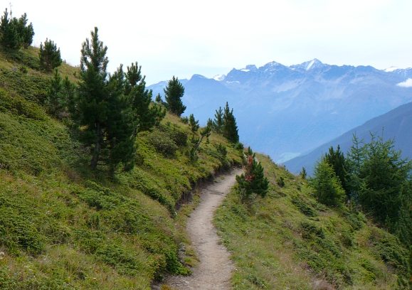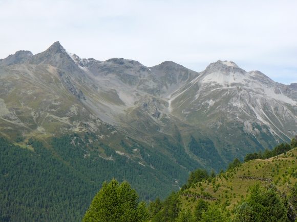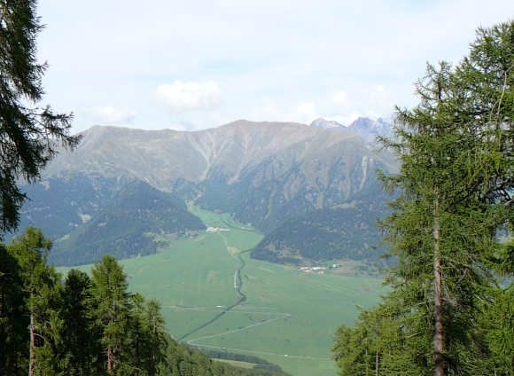 Der Weg führt vollständig weg vom Watles, was mir aber auch recht ist, denn ich möchte den Watles von hinten ersteigen. Erst später sehe ich, dass es sich hier um den regulären Weg zur Sesvennahütte handelt. Er verläuft immer in der Flanke hoch über dem Schlinigtal, ist aber unschwierig zu begehen, und führt teils durch Schutzwald, zumeist aber durch freies Gelände.