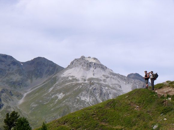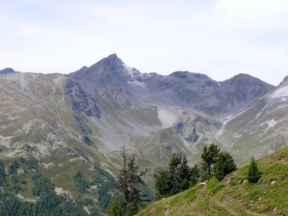 Blick nach Nordwest: Die nächsten 90 Minuten werden von diesem Anblick in Richtung Sesvennahütte dominiert. Der markante Gipfel ist vermutlich der mit 3162 m höchste Gipfel der Region, der Piz Sesvenna.