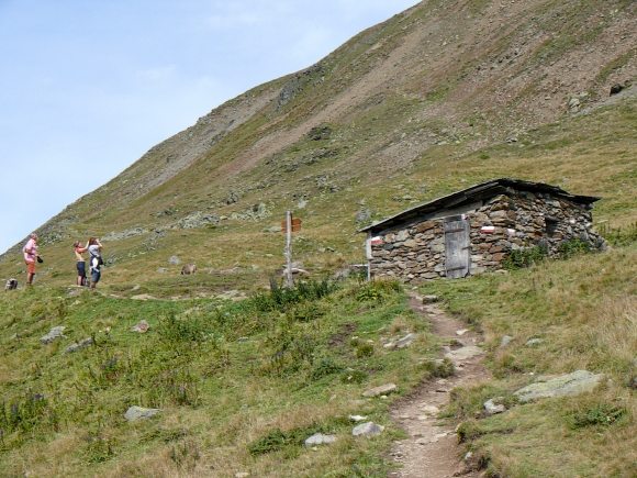 Bald erreiche ich eine Abzweigung, bei der die meisten geradeaus der Sesvennahütte zustreben. Für mich ist hier bei der Schafhütte (2336 m) der Wendepunkt erreicht, bei dem ich zum Anstieg auf den Watles abbiegen muss.