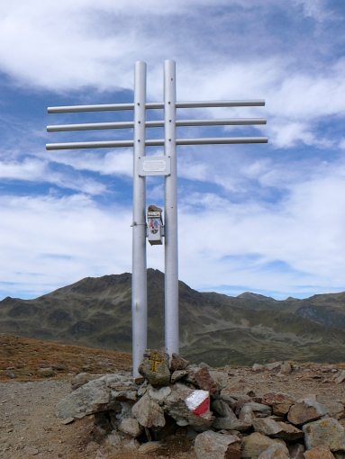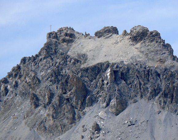 Gipfelkreuz des Piz Sesvennas. Das Kreuz ist gerade noch sichtbar.