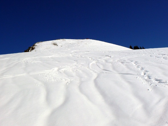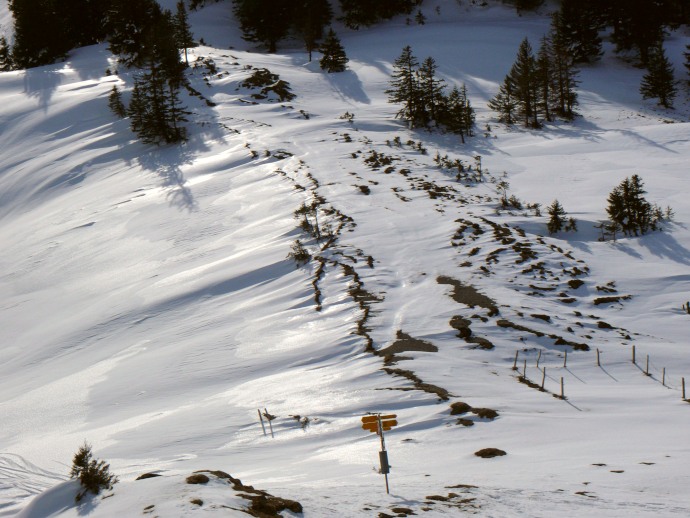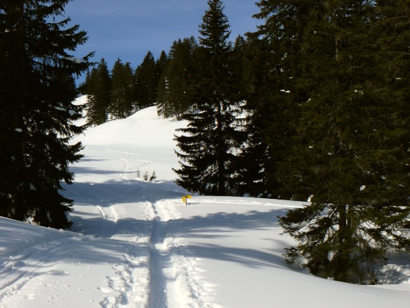 Weiter geht es auf dem Weg durch die steile östliche Flanke. Er ist teils vorbegangen, je nach Lust, Laune und Neugierde weiche ich aber vom vorgegebenen Weg ab und suche mir meinen Weg durch den tiefen Schnee.