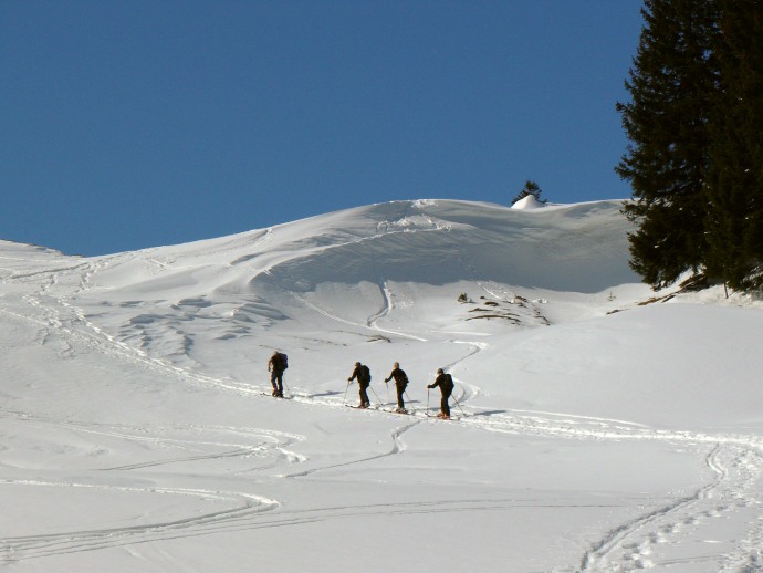 Nach der Gipfelrast und einer Vesperpause geht es auf der Westflanke wieder über den noch teilweise unverspurten Hang abwärts.