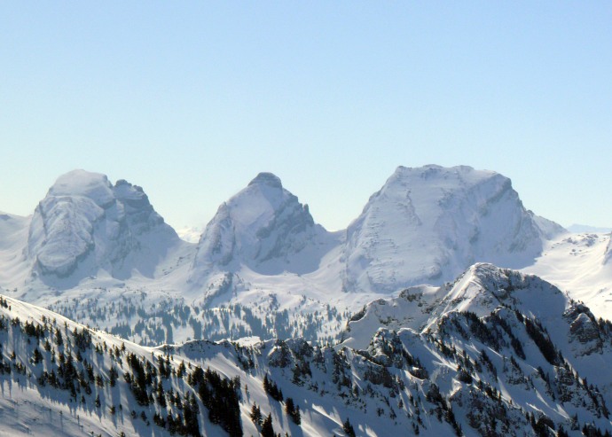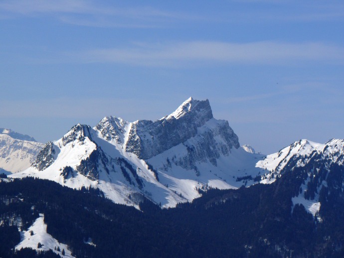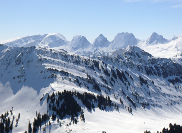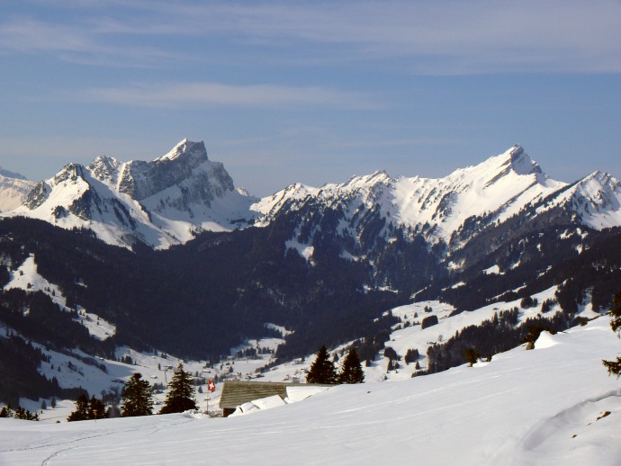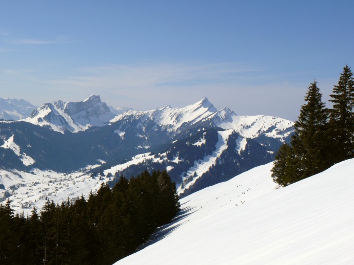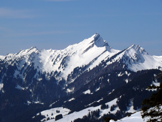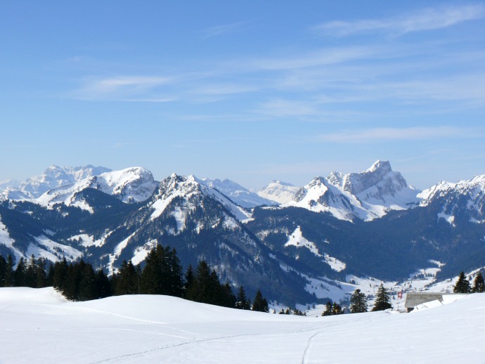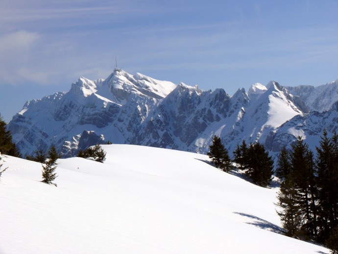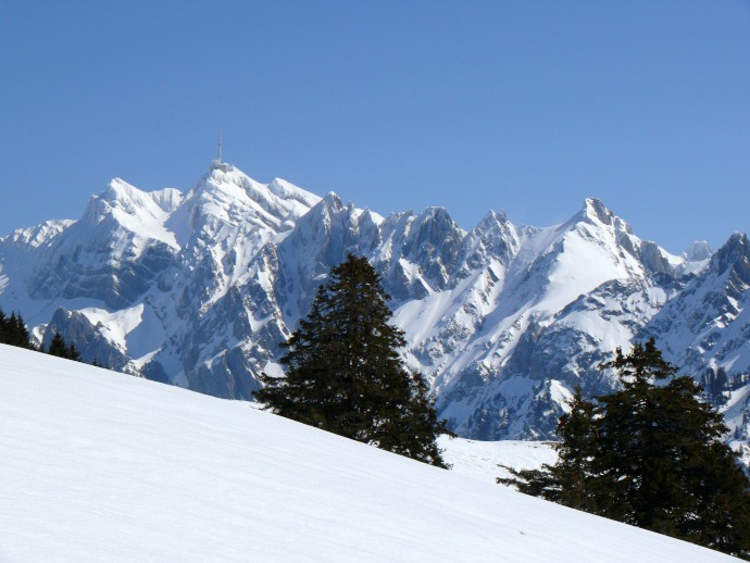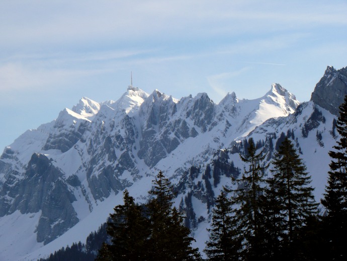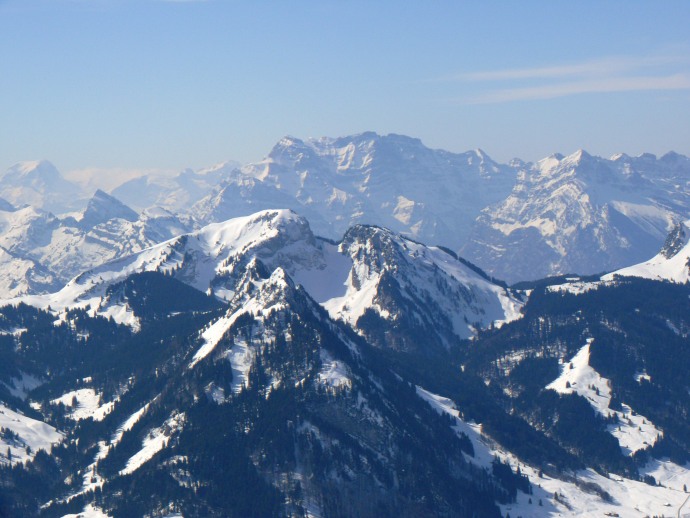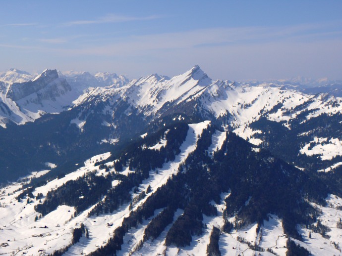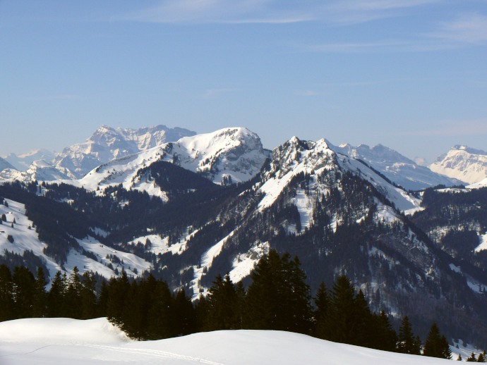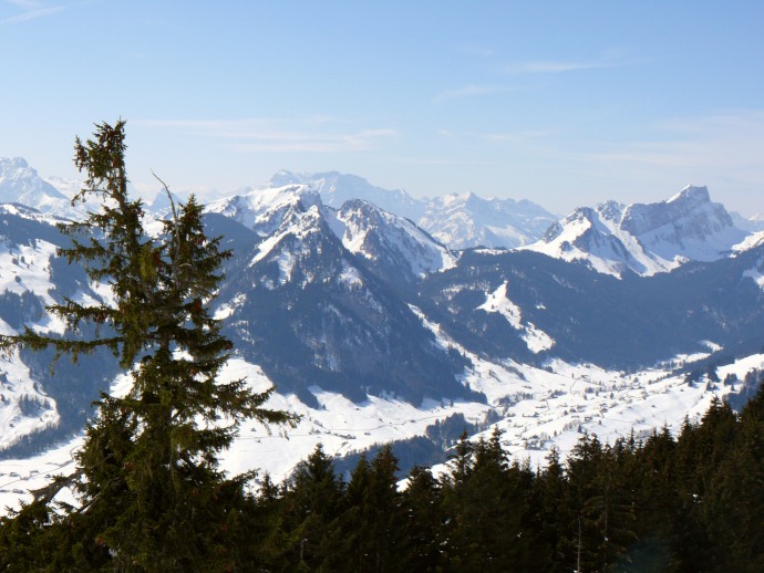 Auf der anderen Seite liegen die aus dieser Perspektive flach erscheinenden Vorberge Kronberg und Spitzli.