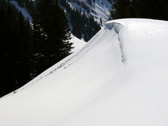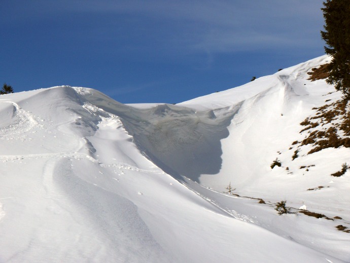 Die eindrucksvolle Mulde mit meterhohe Schneeverwehung und Wächte