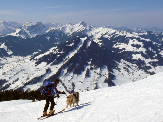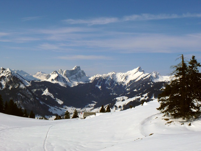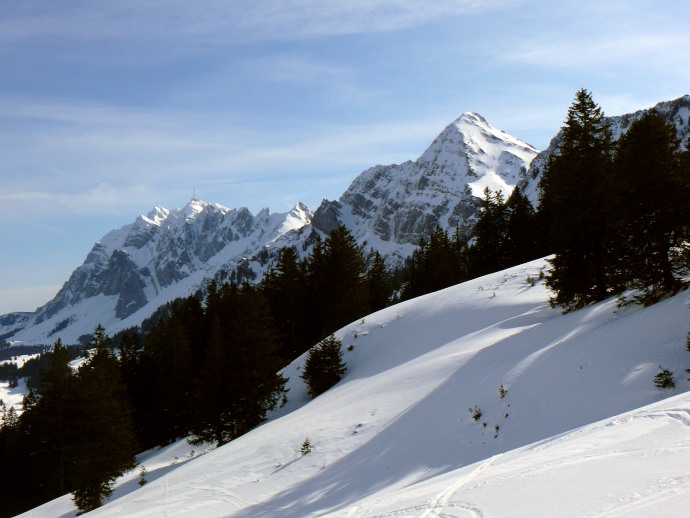 Am Risipass angelangt weitet sich der Blick nach Westen über das Toggenburg hinweg zum Mattsock und Speer, die schneebedeckt ebenfalls einen imposanten Anblick darstellen.
