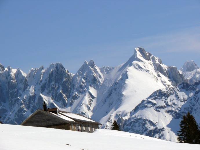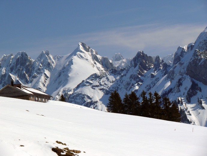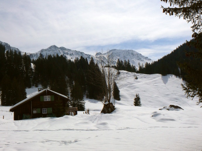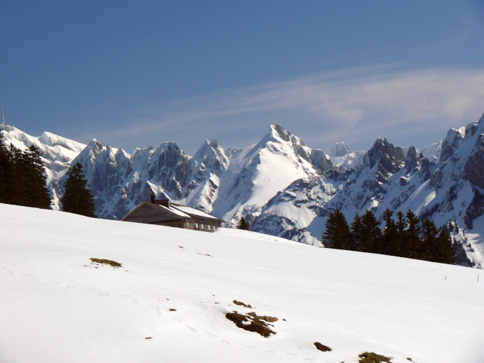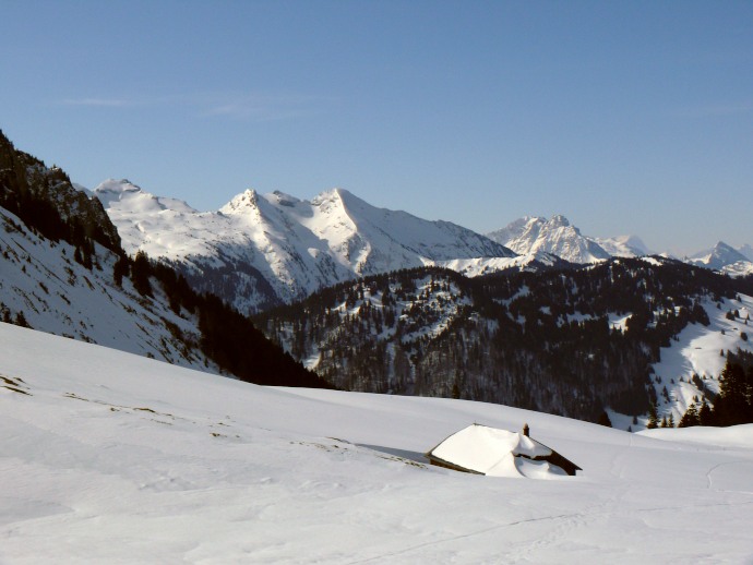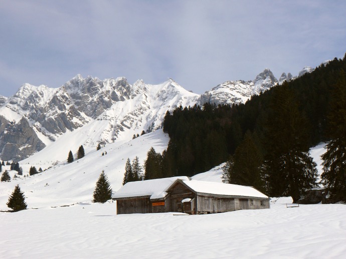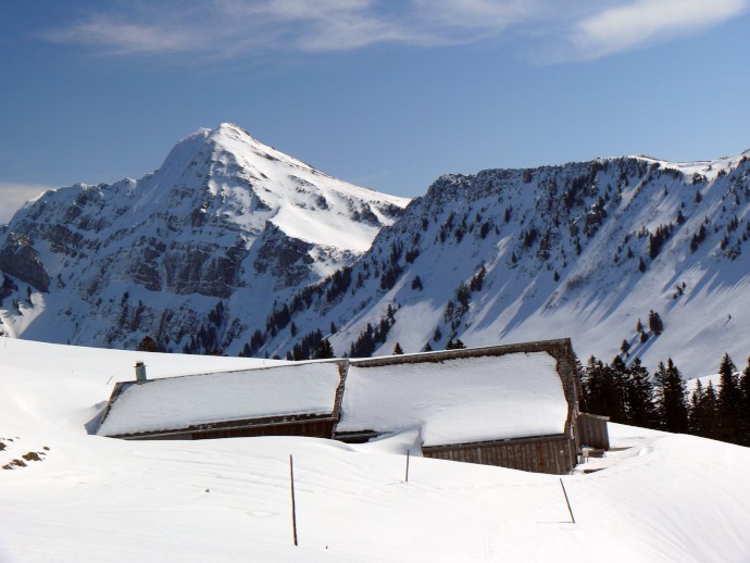 Blick über noch tiefverschneite Almgebäude hinüber zum Lütispitz.