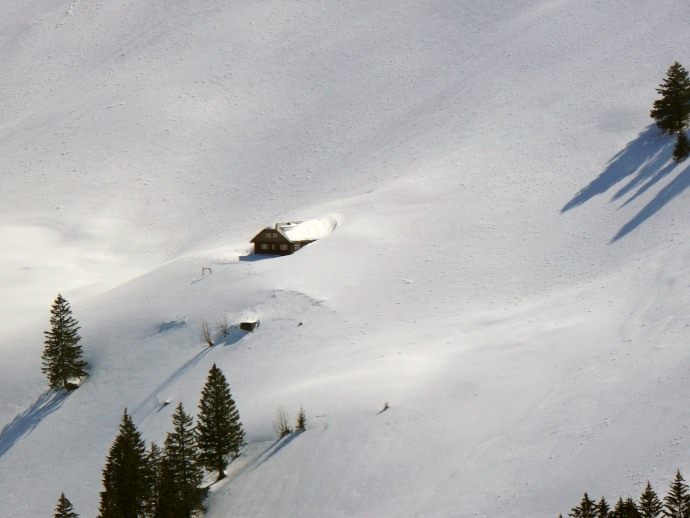 Wintereinsamkeit auf den Bergalmen - deutlich zu erkennen ist, wie die Gebäude lawinengeschützt angelegt sind und sich an die Bergflanken angeschmiegt haben.