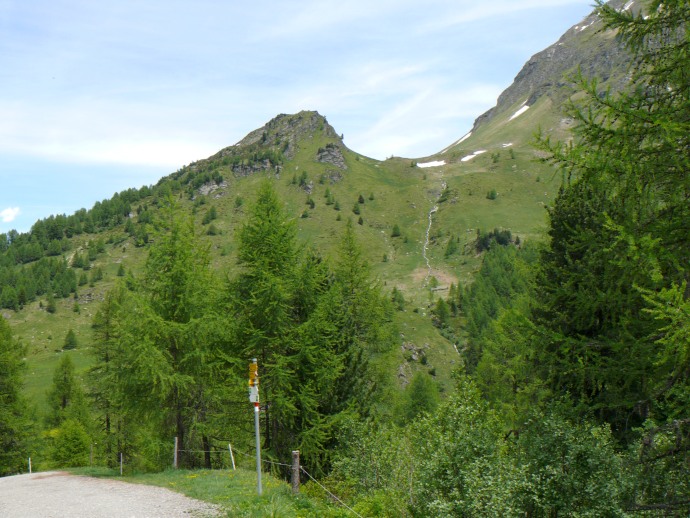 Von hier aus führen zwei Wege hoch zum Cavlocsee. Der eine verläuft nur wenig ansteigend nach Osten, der andere - hier bereits andeutungsweise sichtbar - steigt zunächst einmal in der Flanke steil an, um dann hoch über dem Cavlocsee einen grandiosen Ausblick über das Fornotal zu bieten. Da wir diesen Weg noch nie begangen haben, wende ich mich heute diesem neuen Weg zu.