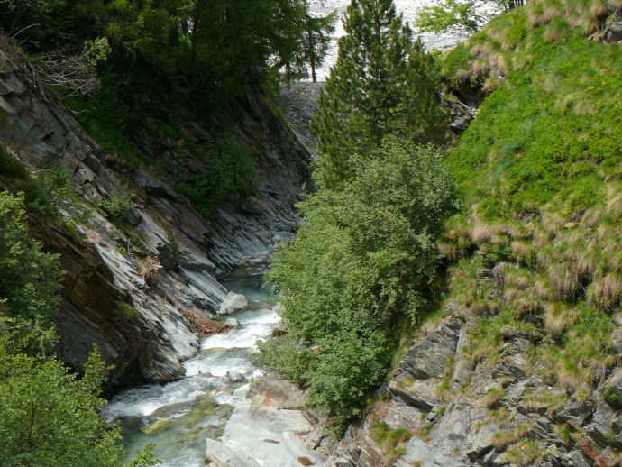 Über eine Brücke quert man das tief eingeschnittene Bachbett der Orlegna, für deren Jahrhunderthochwässer die Bewohner das große Rückhaltebecken geschaffen haben. Es soll taleinwärts größere Verwüstungen vermeiden helfen. Das letzte Mal wurde die Schutzwirkung 1987 benötigt, so dass das Bergell von den verwüstenden Folgen verheerender Hochwässer verschont blieb.