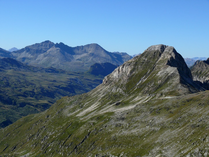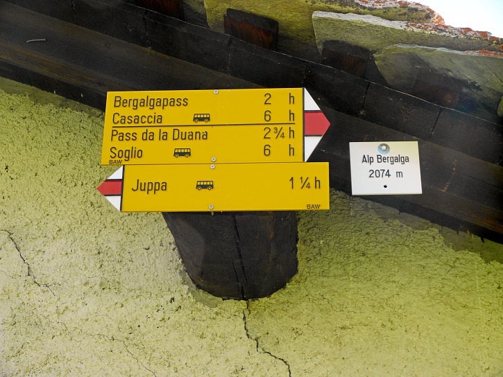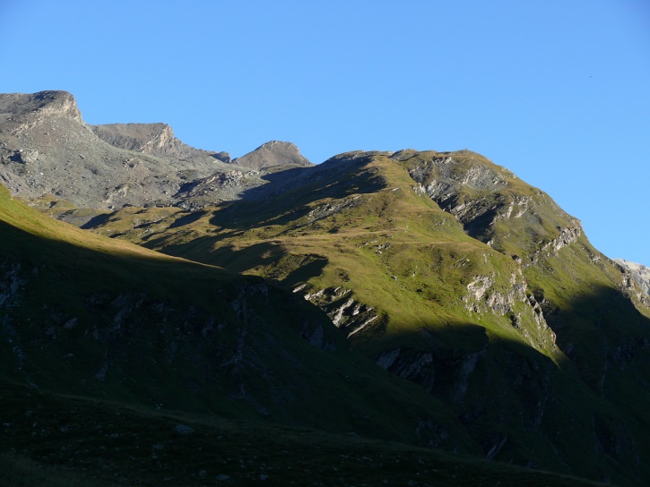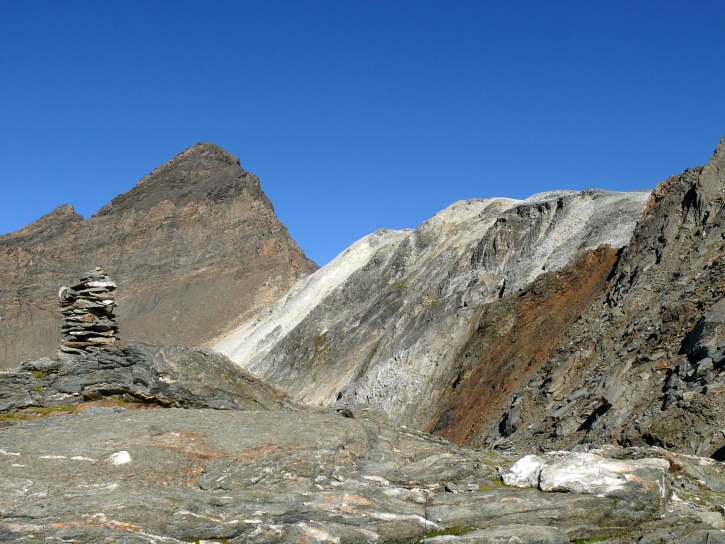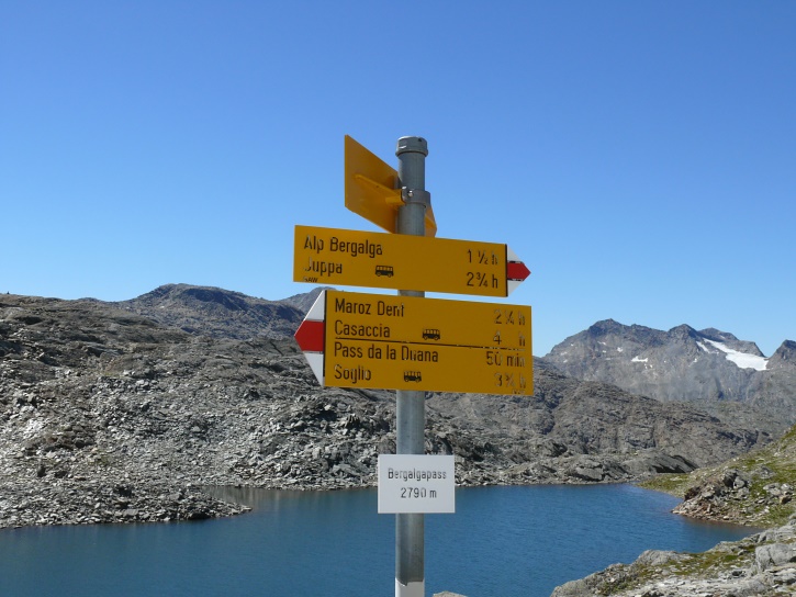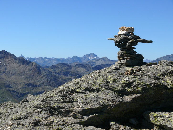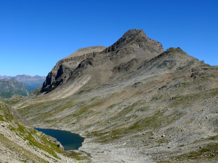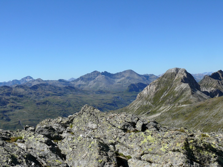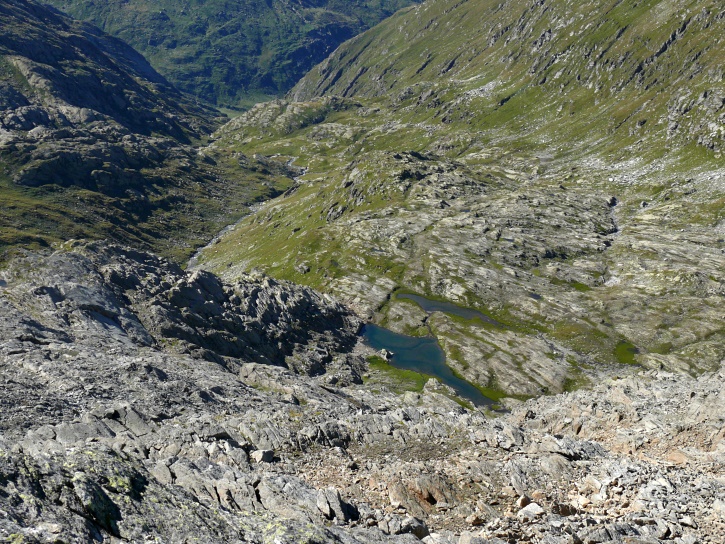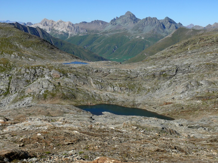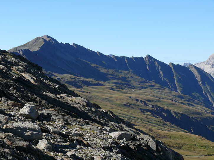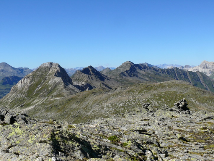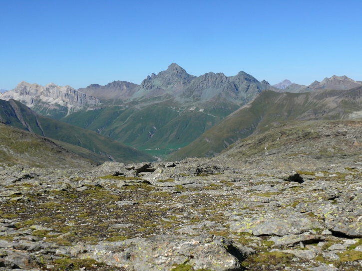 Am zweiten Tag ging es von Juppa aus in einem Gewaltmarsch (22 km) nach Süden zum Bergalga-Pass und weiter zum Piz dal Märc (bzw. dessen Nebengipfel, ca. 2940 m), von dem aus man eine gute Sicht auf die Bergeller Berggipfel (und wenn man wie ich Glück hat auch auf eine Steinbock-Kolonie) hat. Hier offenbart sich leider ein schwerer touristischer Nachteil der Gegend um Juf: Bewandert wird sie in der Regel nur als Durchgangsetappe. Rundtouren sind nur schwer zusammenzustellen, will man nicht gerade 10 h auf den Beinen sein.