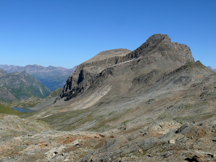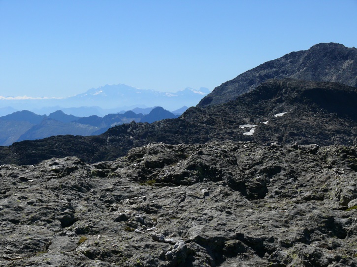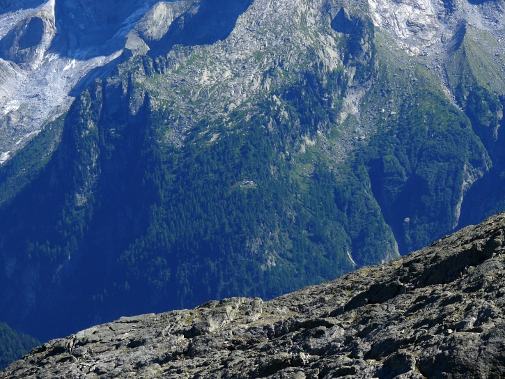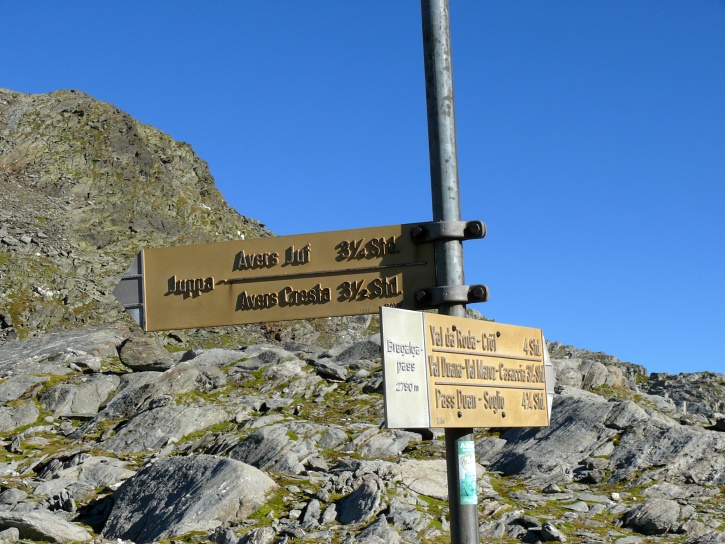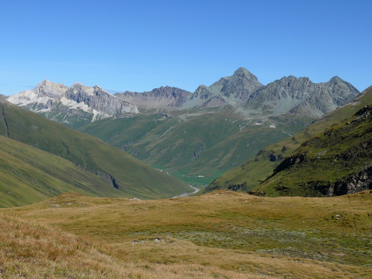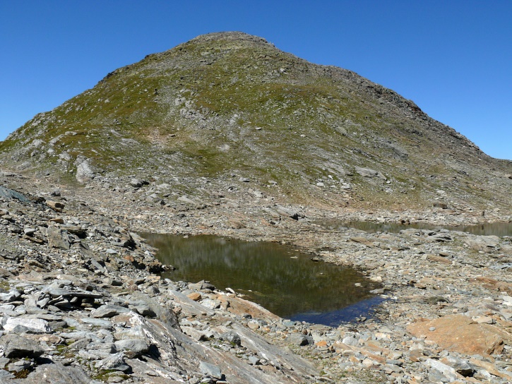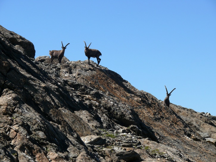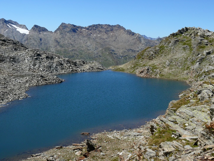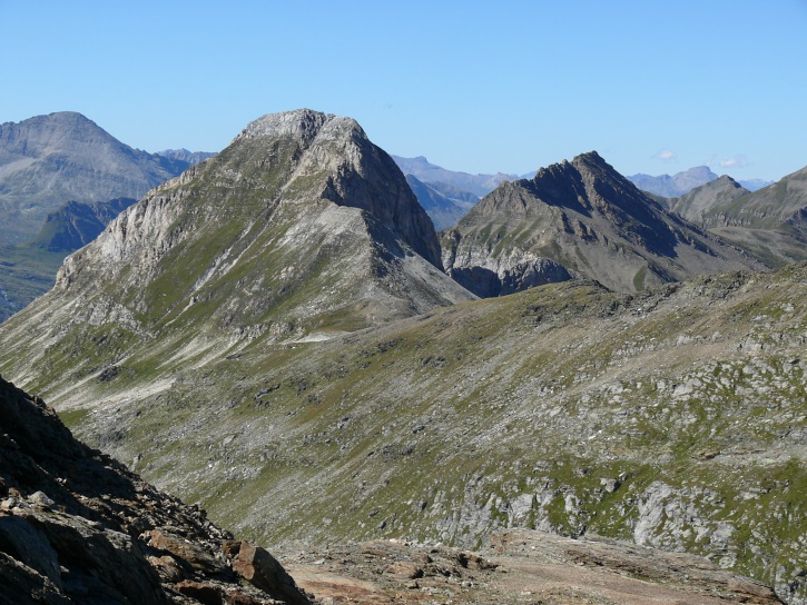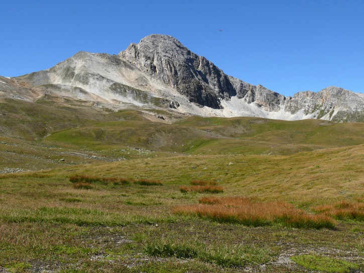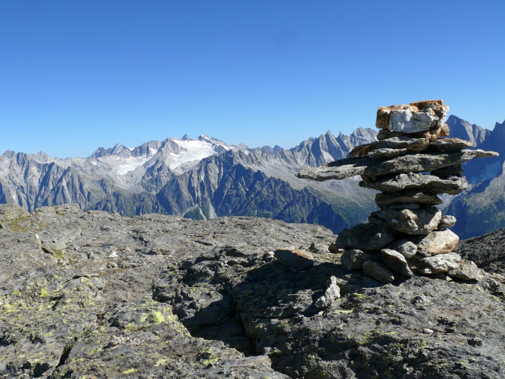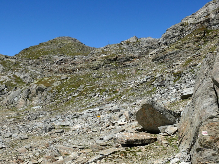 Am zweiten Tag ging es von Juppa aus in einem Gewaltmarsch (22 km) nach Süden zum Bergalga-Pass und weiter zum Piz dal Märc (bzw. dessen Nebengipfel, ca. 2940 m), von dem aus man eine gute Sicht auf die Bergeller Berggipfel (und wenn man wie ich Glück hat auch auf eine Steinbock-Kolonie) hat. Hier offenbart sich leider ein schwerer touristischer Nachteil der Gegend um Juf: Bewandert wird sie in der Regel nur als Durchgangsetappe. Rundtouren sind nur schwer zusammenzustellen, will man nicht gerade 10 h auf den Beinen sein.