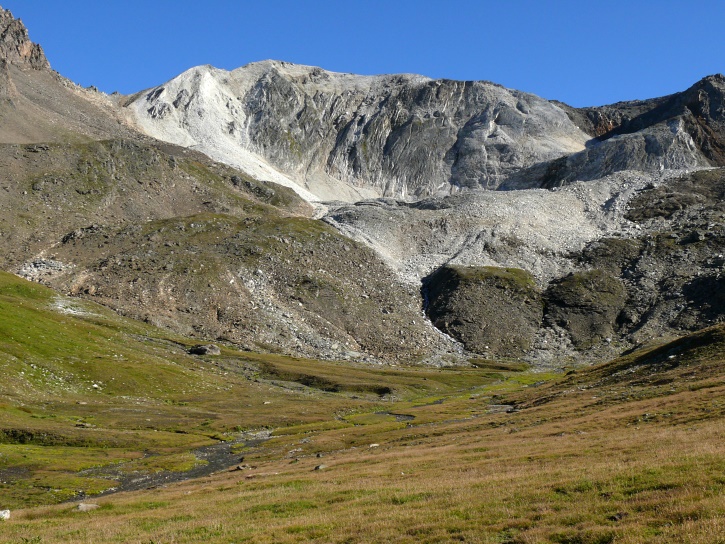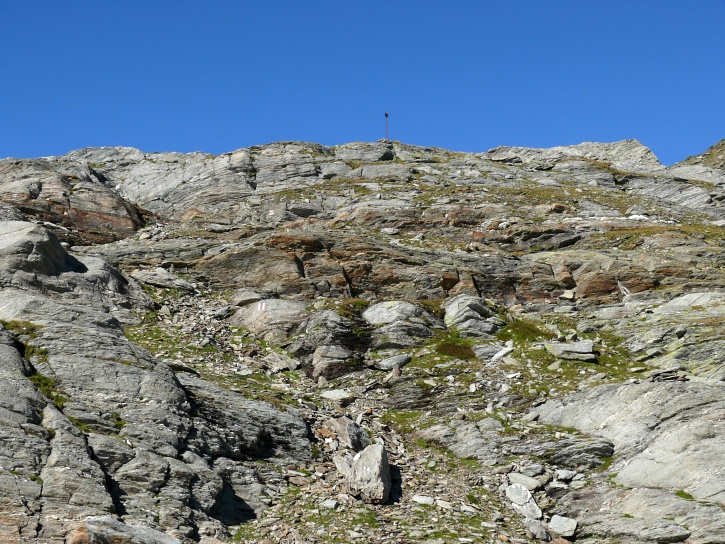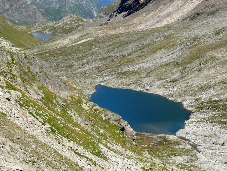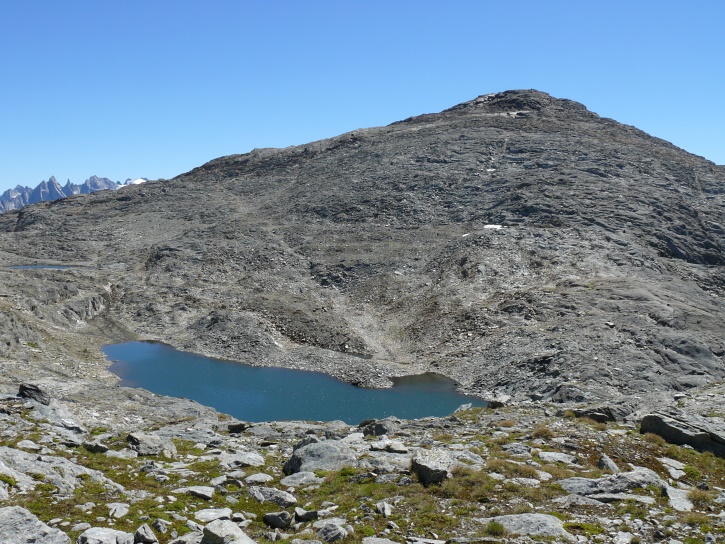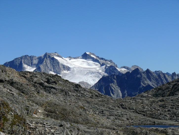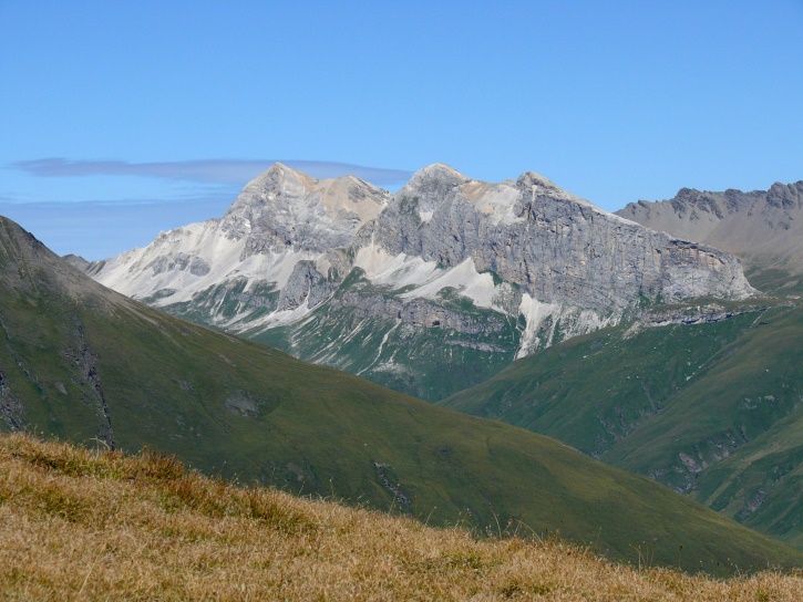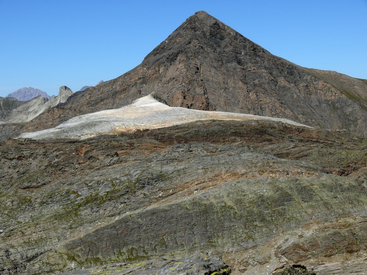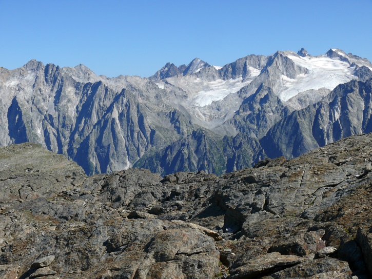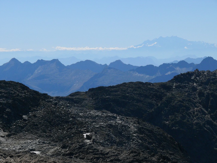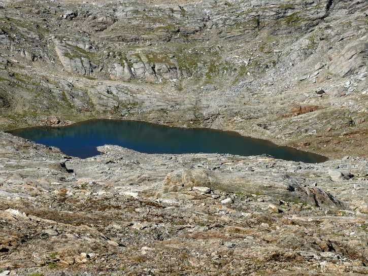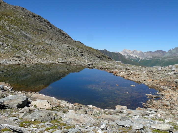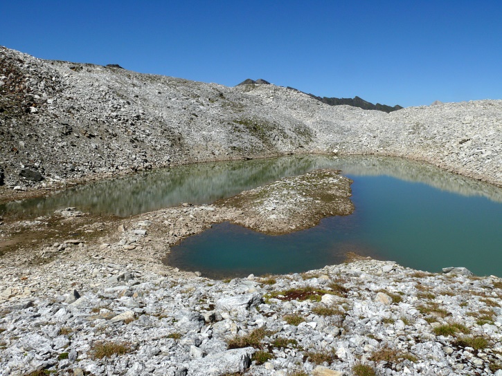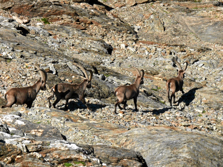 Am zweiten Tag ging es von Juppa aus in einem Gewaltmarsch (22 km) nach Süden zum Bergalga-Pass und weiter zum Piz dal Märc (bzw. dessen Nebengipfel, ca. 2940 m), von dem aus man eine gute Sicht auf die Bergeller Berggipfel (und wenn man wie ich Glück hat auch auf eine Steinbock-Kolonie) hat. Hier offenbart sich leider ein schwerer touristischer Nachteil der Gegend um Juf: Bewandert wird sie in der Regel nur als Durchgangsetappe. Rundtouren sind nur schwer zusammenzustellen, will man nicht gerade 10 h auf den Beinen sein.
