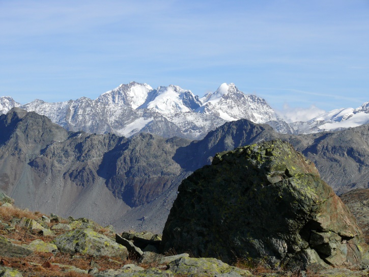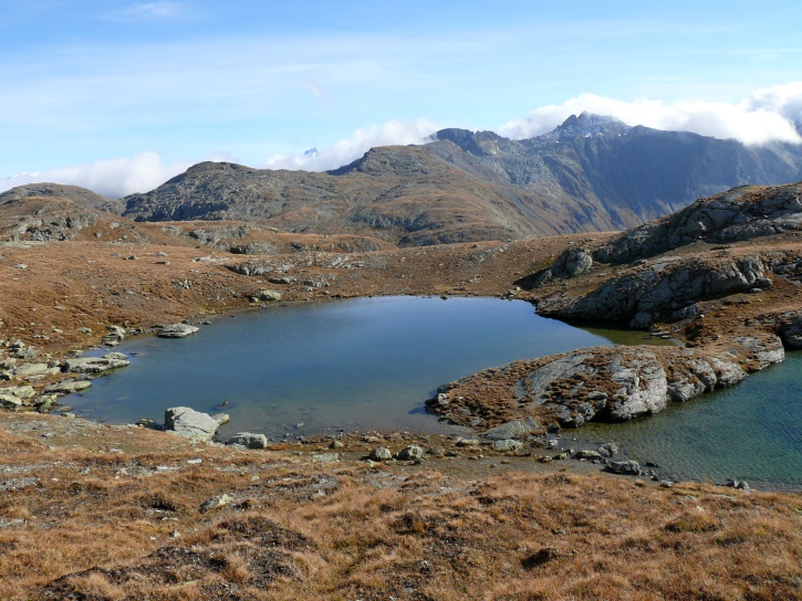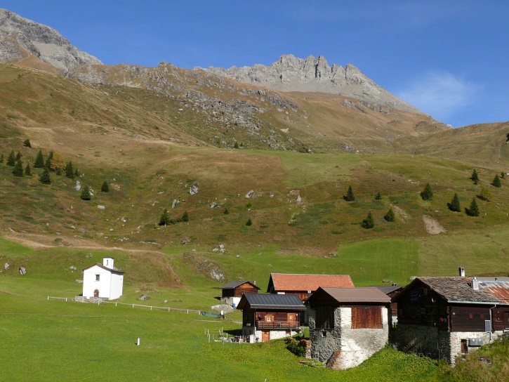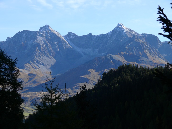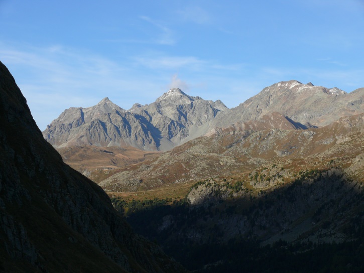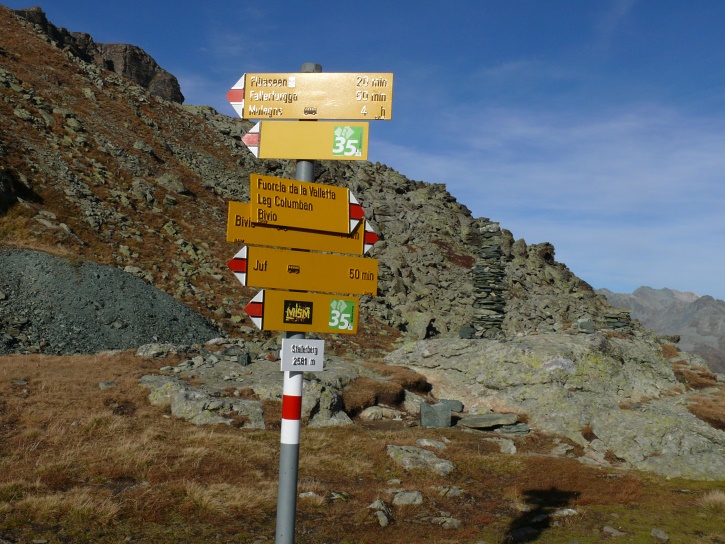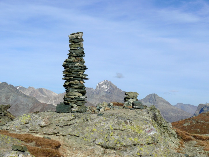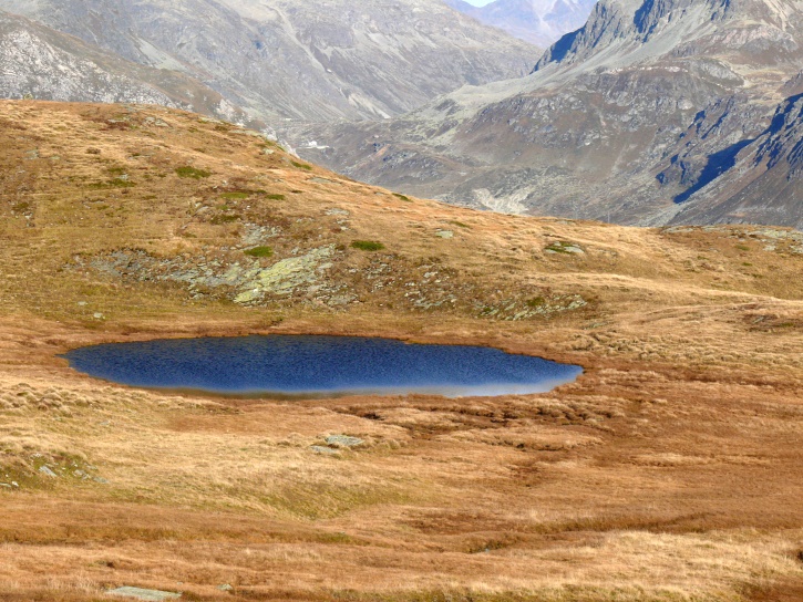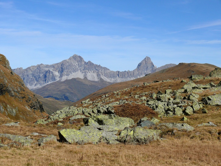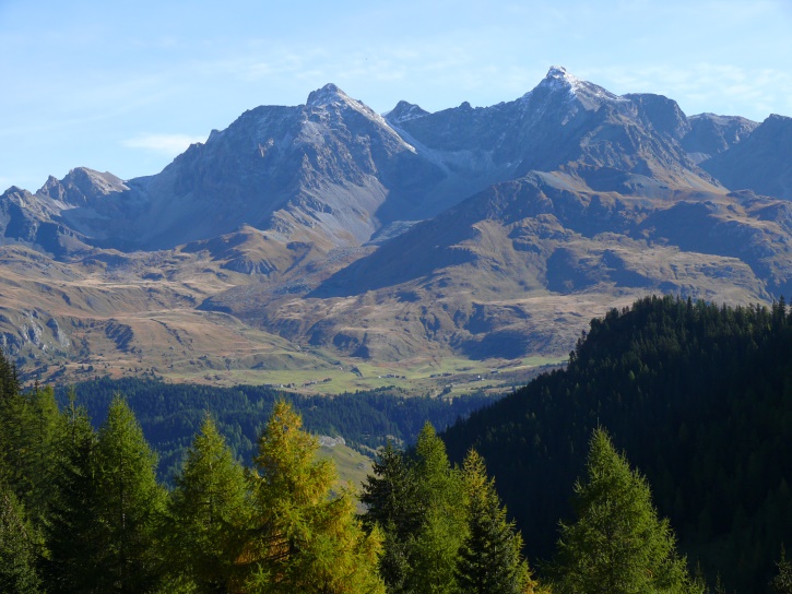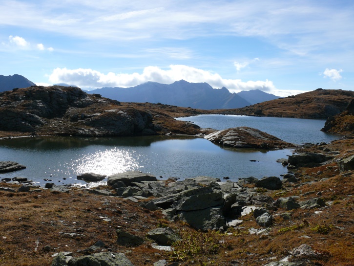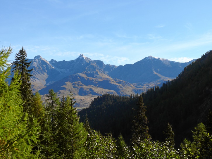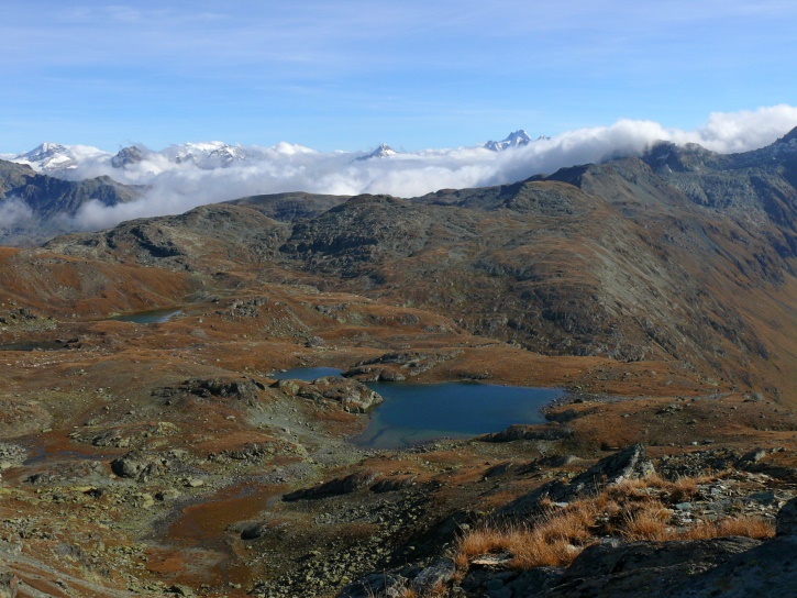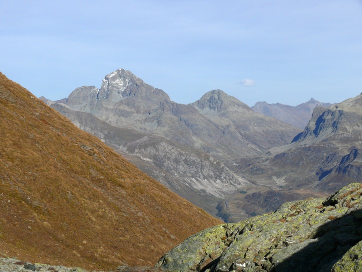 Am folgenden Tag ist der Himmel strahlend blau und verheißt einen angenehmeren Wandertag. Von Mulegns aus geht es durchs Fallertal hoch zur 1600 m höher gelegenen Fallerfurgga. Bald dominiert das kantige pyramidenförmige Profil des Piz Platta (3392 m) die Sicht, das Gehör wird mit ungewöhnlichen stöhnenden Geräuschen bombardiert, nämlich dem Röhren der brünftigen Hirsche. Bei der Fallerfurgga weitet sich der Blick schlagartig und man gerät angesichts des 360°-Gipfelblickes geradezu in Verzückung! Insbesondere die Eisriesen der Berninagruppe sind sehr beeindruckend! Ein weiteres Highlight sind die Flüeseen, eine Ansammlung von vier funkelnden Seen. Über Stallerberg gehrt es nun abwärts nach Bivio, wo mich der Postbus, dank Gästekarte gratis, zum Ausgangspunkt bringt.