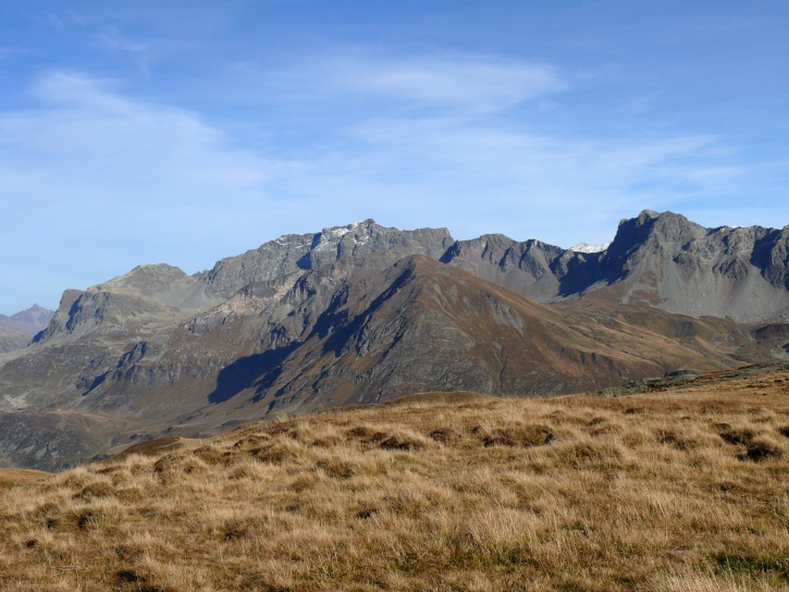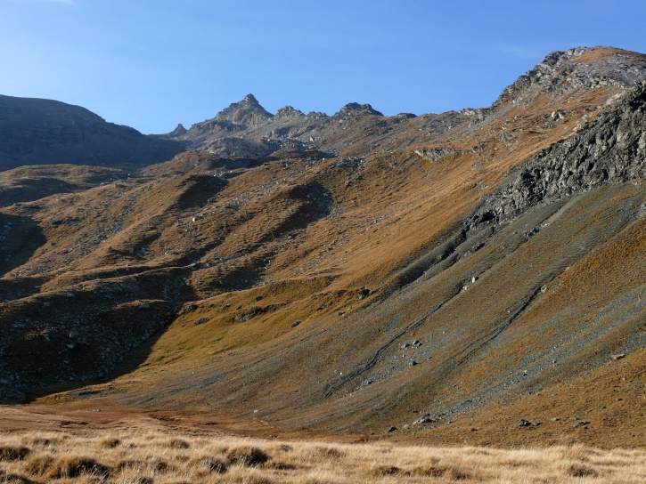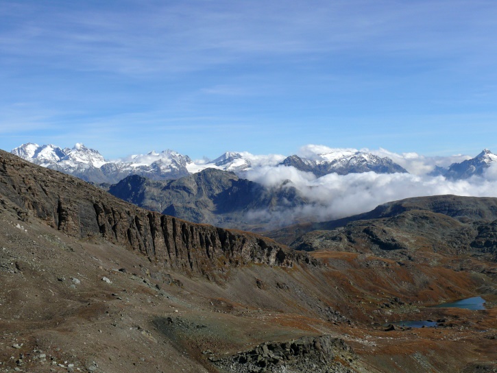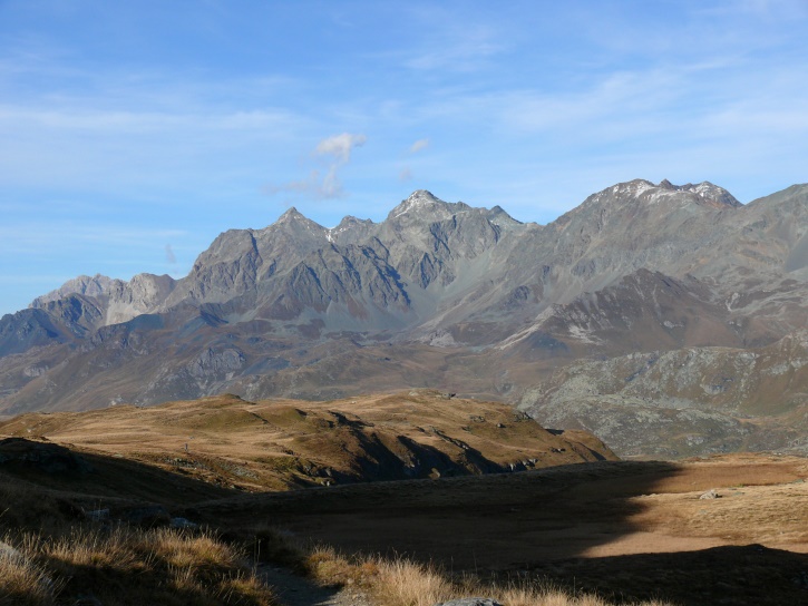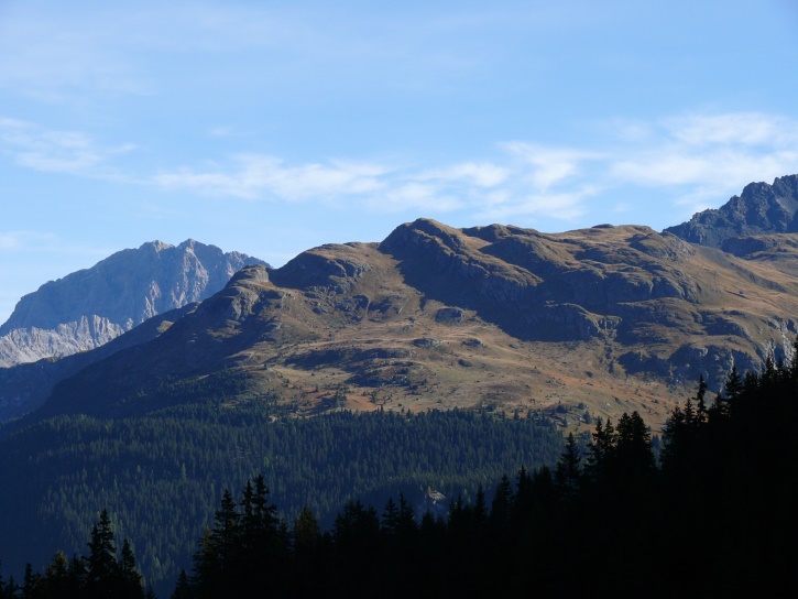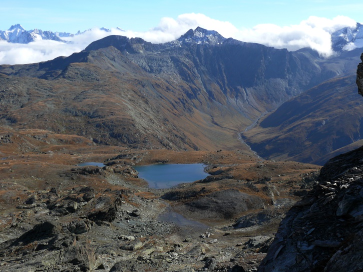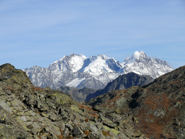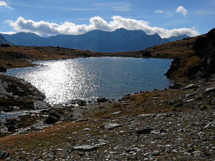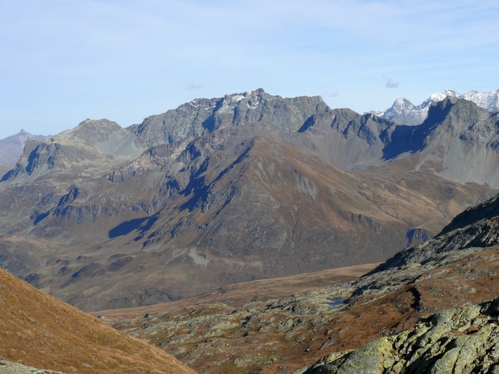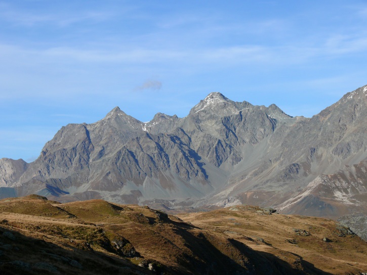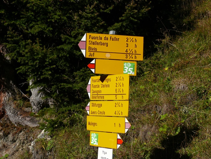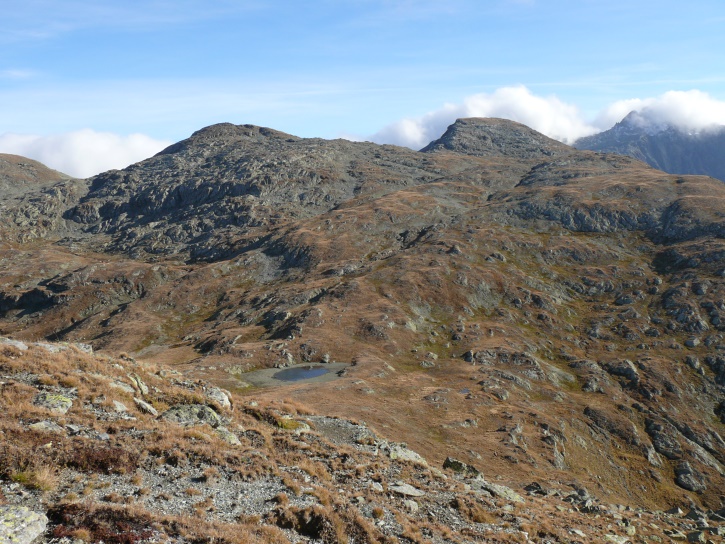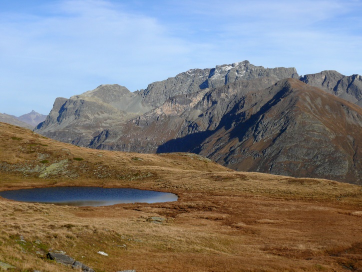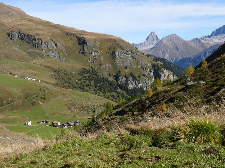 Am folgenden Tag ist der Himmel strahlend blau und verheißt einen angenehmeren Wandertag. Von Mulegns aus geht es durchs Fallertal hoch zur 1600 m höher gelegenen Fallerfurgga. Bald dominiert das kantige pyramidenförmige Profil des Piz Platta (3392 m) die Sicht, das Gehör wird mit ungewöhnlichen stöhnenden Geräuschen bombardiert, nämlich dem Röhren der brünftigen Hirsche. Bei der Fallerfurgga weitet sich der Blick schlagartig und man gerät angesichts des 360°-Gipfelblickes geradezu in Verzückung! Insbesondere die Eisriesen der Berninagruppe sind sehr beeindruckend! Ein weiteres Highlight sind die Flüeseen, eine Ansammlung von vier funkelnden Seen. Über Stallerberg gehrt es nun abwärts nach Bivio, wo mich der Postbus, dank Gästekarte gratis, zum Ausgangspunkt bringt.