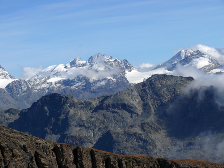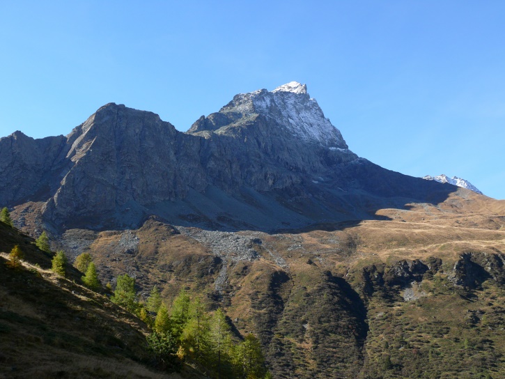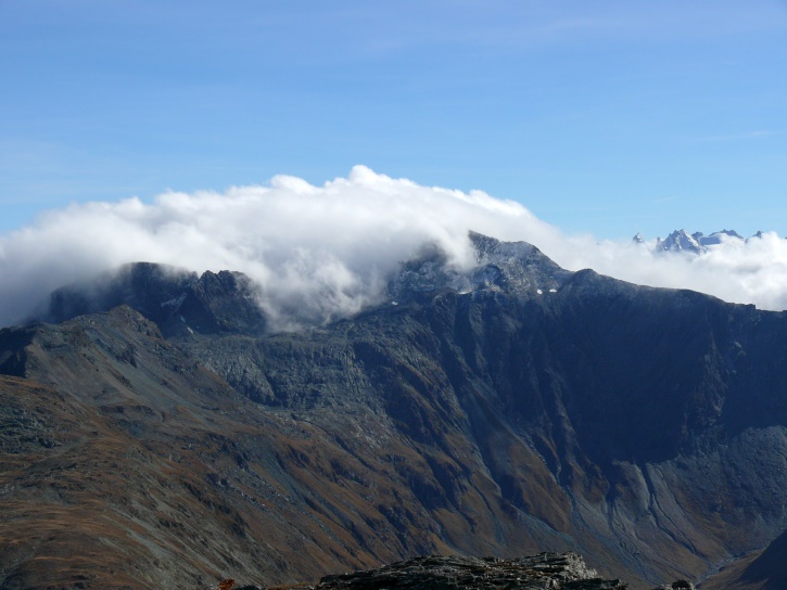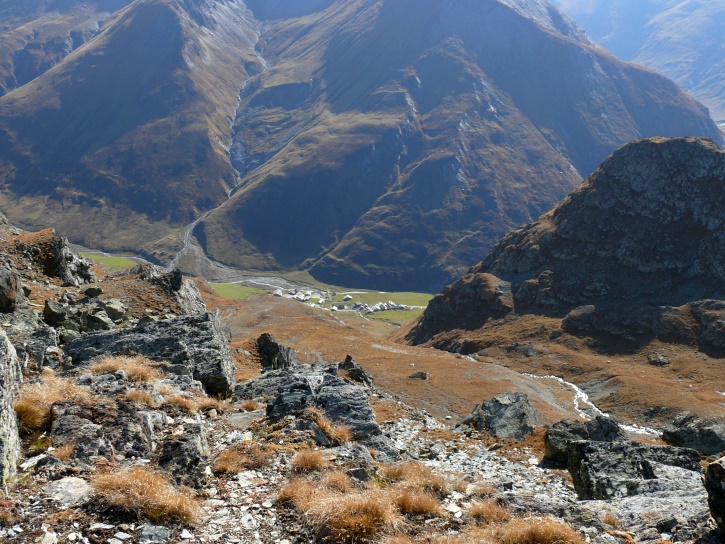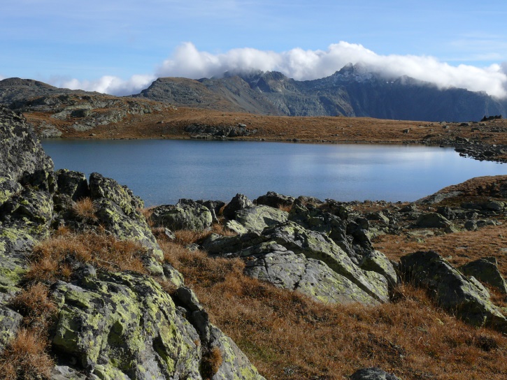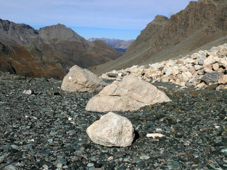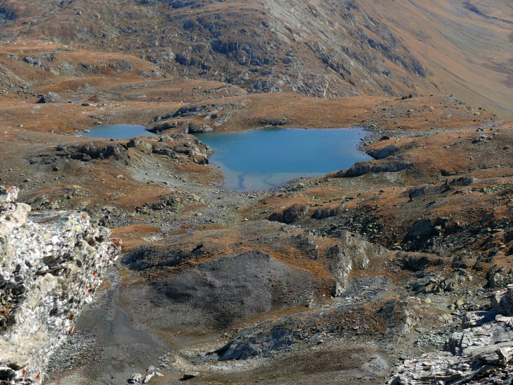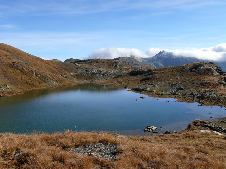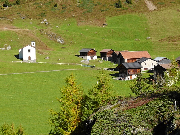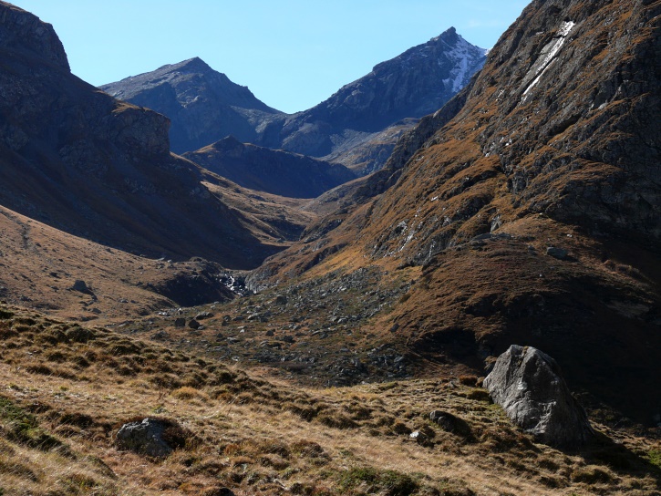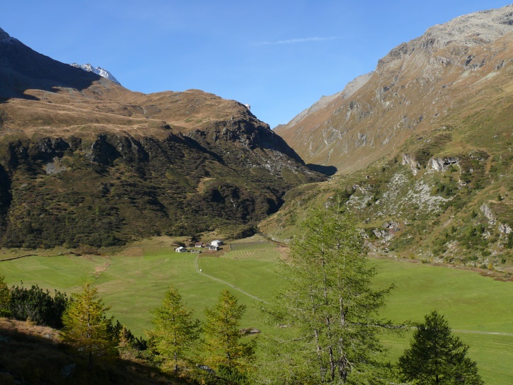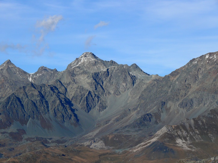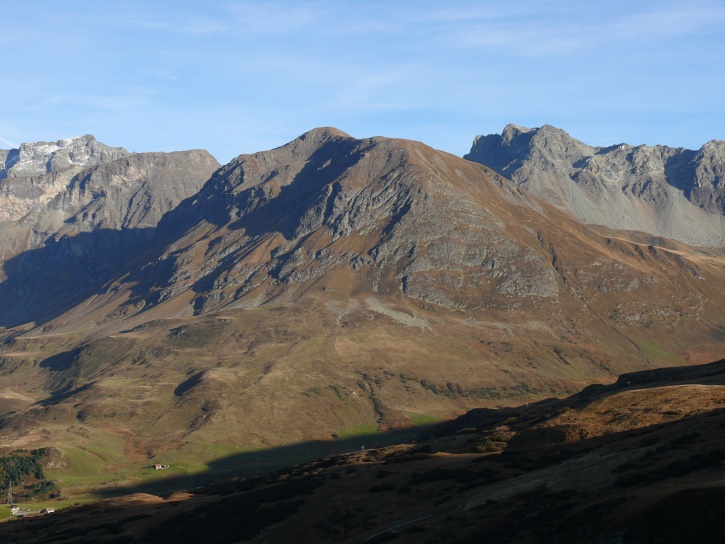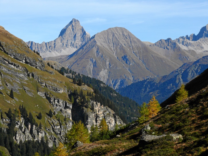 Am folgenden Tag ist der Himmel strahlend blau und verheißt einen angenehmeren Wandertag. Von Mulegns aus geht es durchs Fallertal hoch zur 1600 m höher gelegenen Fallerfurgga. Bald dominiert das kantige pyramidenförmige Profil des Piz Platta (3392 m) die Sicht, das Gehör wird mit ungewöhnlichen stöhnenden Geräuschen bombardiert, nämlich dem Röhren der brünftigen Hirsche. Bei der Fallerfurgga weitet sich der Blick schlagartig und man gerät angesichts des 360°-Gipfelblickes geradezu in Verzückung! Insbesondere die Eisriesen der Berninagruppe sind sehr beeindruckend! Ein weiteres Highlight sind die Flüeseen, eine Ansammlung von vier funkelnden Seen. Über Stallerberg gehrt es nun abwärts nach Bivio, wo mich der Postbus, dank Gästekarte gratis, zum Ausgangspunkt bringt.
