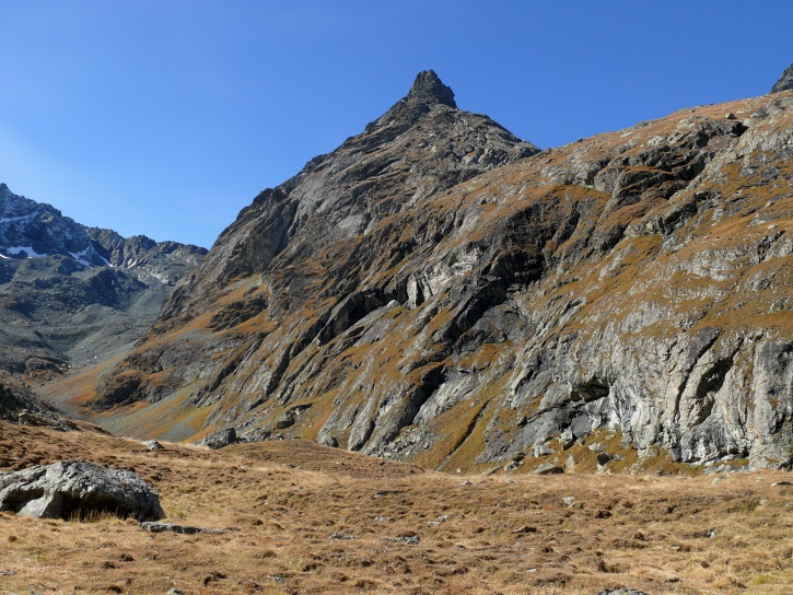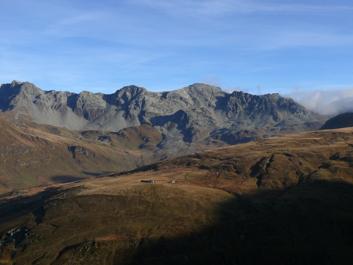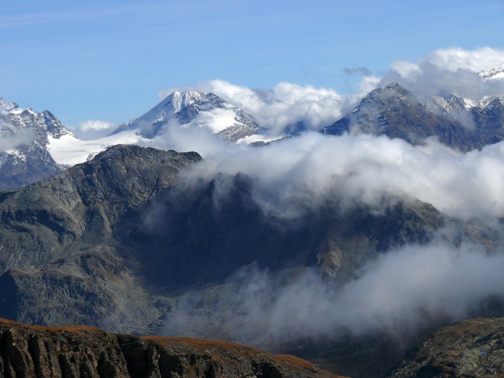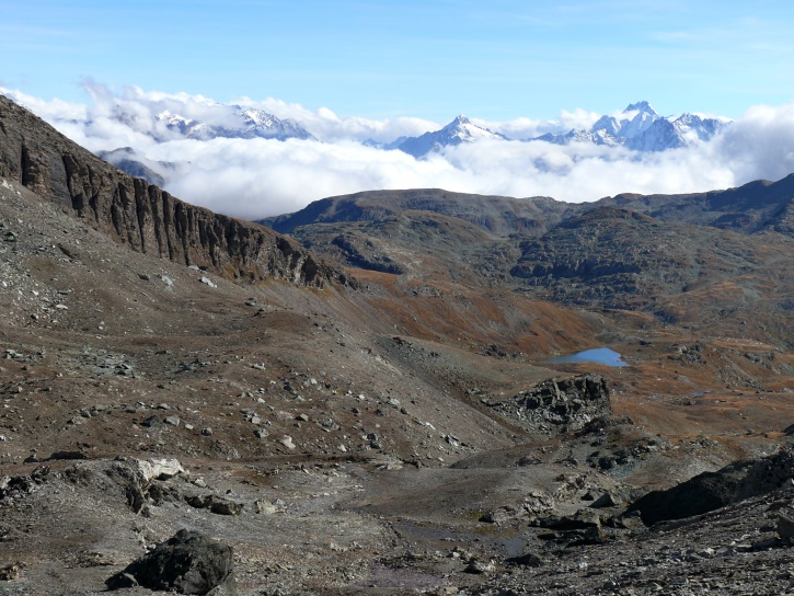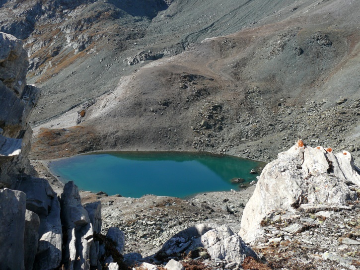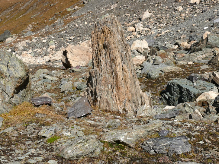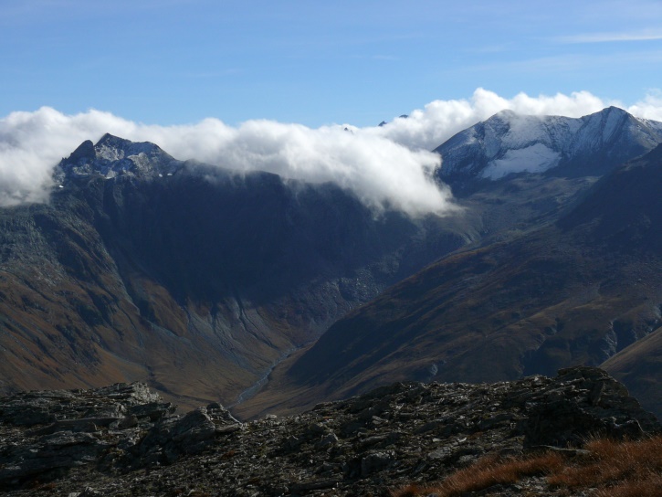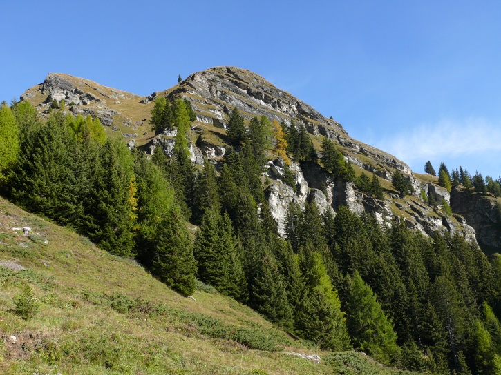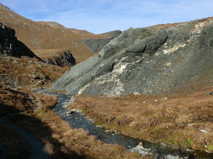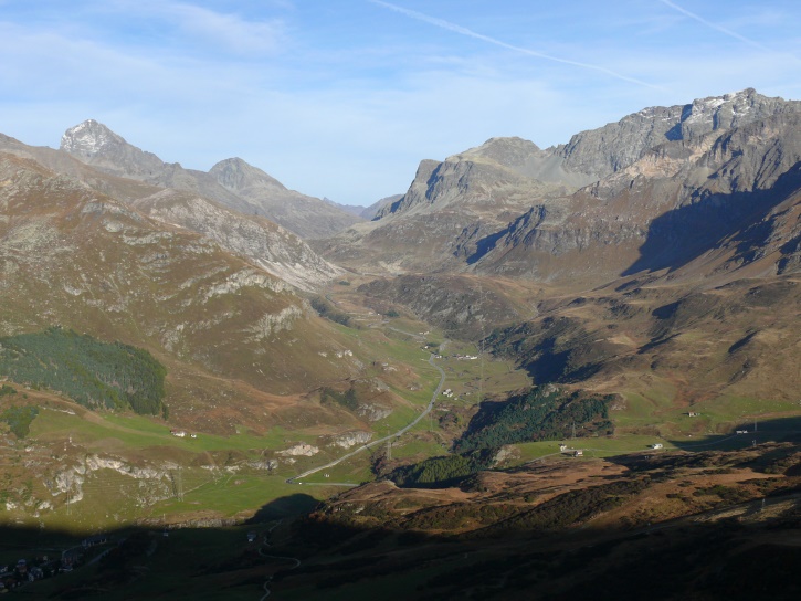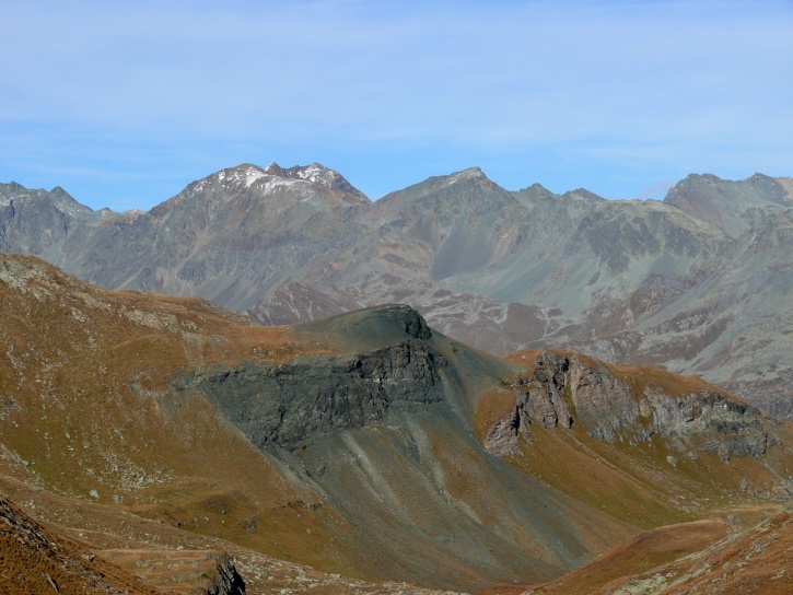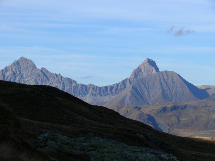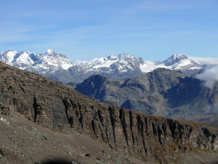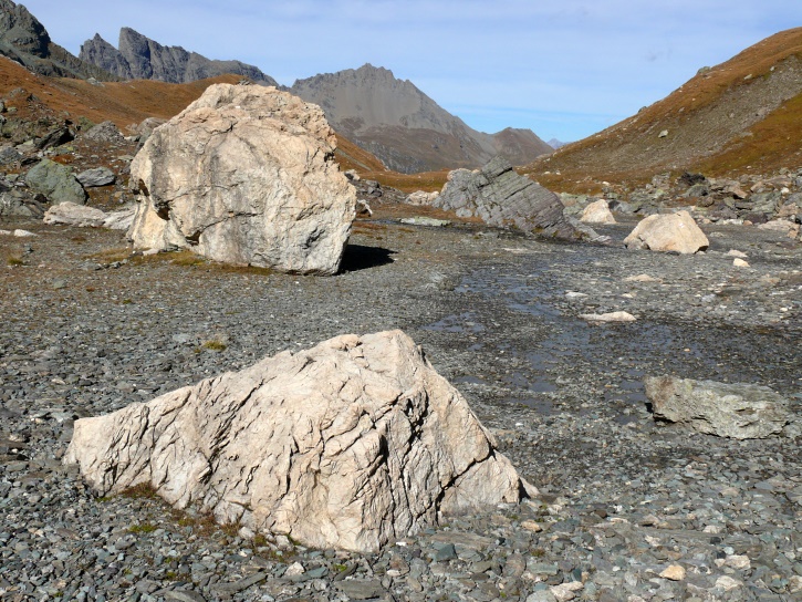 Am folgenden Tag ist der Himmel strahlend blau und verheißt einen angenehmeren Wandertag. Von Mulegns aus geht es durchs Fallertal hoch zur 1600 m höher gelegenen Fallerfurgga. Bald dominiert das kantige pyramidenförmige Profil des Piz Platta (3392 m) die Sicht, das Gehör wird mit ungewöhnlichen stöhnenden Geräuschen bombardiert, nämlich dem Röhren der brünftigen Hirsche. Bei der Fallerfurgga weitet sich der Blick schlagartig und man gerät angesichts des 360°-Gipfelblickes geradezu in Verzückung! Insbesondere die Eisriesen der Berninagruppe sind sehr beeindruckend! Ein weiteres Highlight sind die Flüeseen, eine Ansammlung von vier funkelnden Seen. Über Stallerberg gehrt es nun abwärts nach Bivio, wo mich der Postbus, dank Gästekarte gratis, zum Ausgangspunkt bringt.