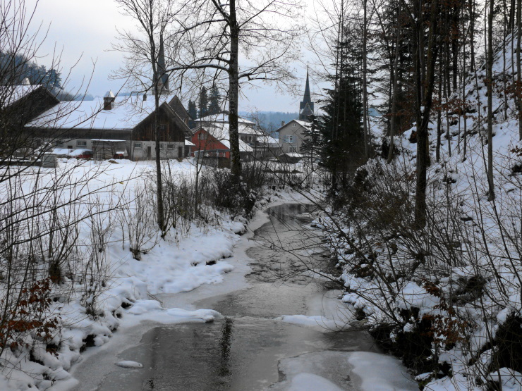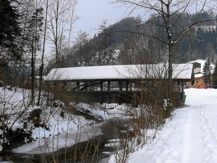 Blick bei Dussnang auf ein überdachtes Brücklein über den Tanneggerbach