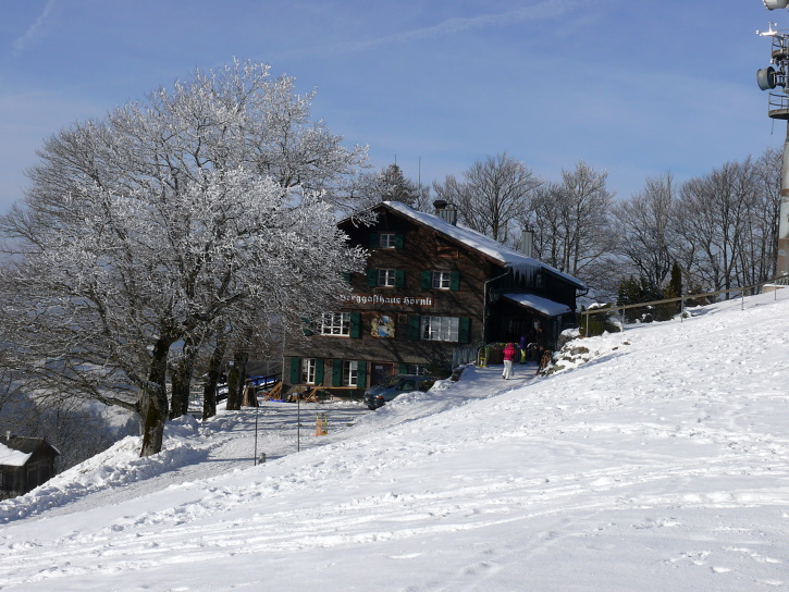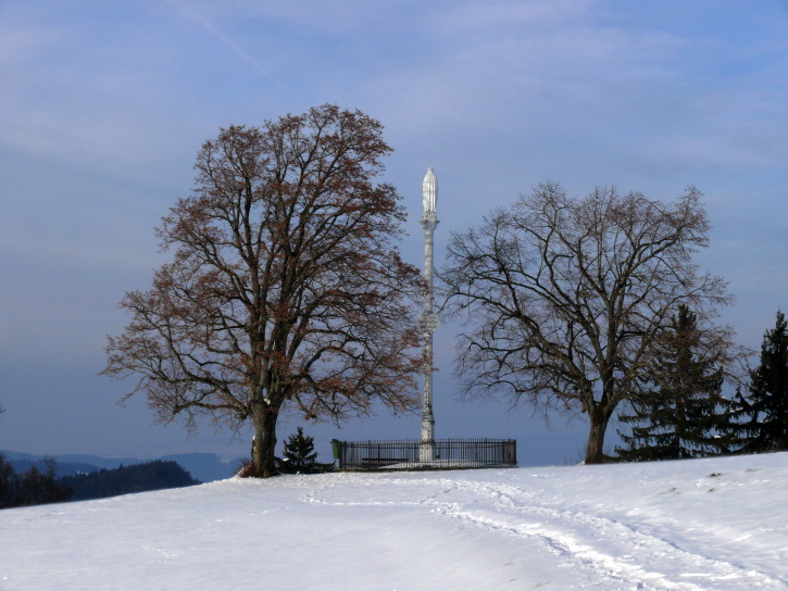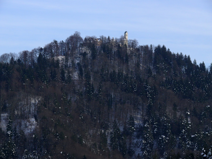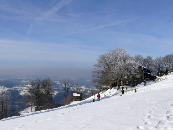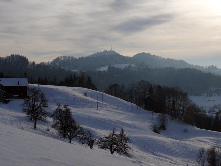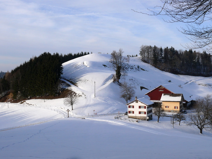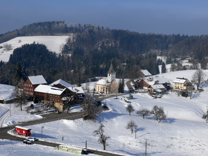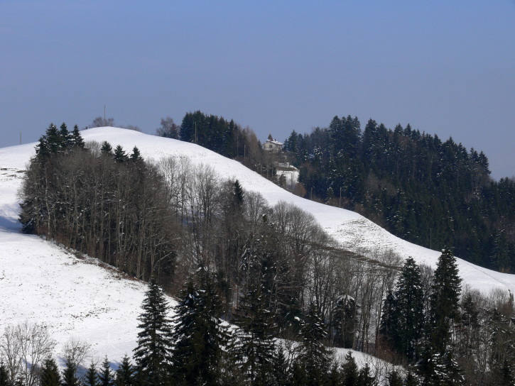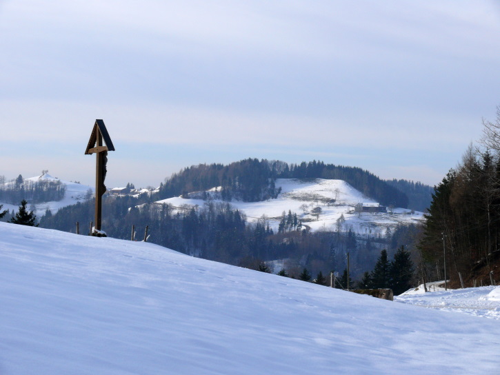 Wie vom Wetterbericht angekündigt, löst sich der Nebel langsam auf, aber es bleibt bitter kalt. Schon nach 2 Stunden bin ich oberhalb von Bäärlischwand am höchsten Punkt angelangt und entscheide mich angesichts des noch frühen Tages für eine Verlängerung mit dem in der Ferne sichtbaren Hörnli als zusätzlichem Tagesziel. Nach einer langen Durststrecke auf Asphalt (Züri-Oberland-Höhenweg) und einem kurzen, rutschigen Aufstieg stehe ich tatsächlich auf dem Gipfel des Hörnli, wo ein kräftiger Wind für noch frostigere Verhältnisse sorgt. Trotzdem speisen einige Gäste im Freien, die Hütte selbst ist an dem inzwischen sonnigen Wintertag hoffnungslos überfüllt. Viele fahren von dort mit einem der vielen Leihschlitten ab, für mich geht es aber zunächst auf dem gleichen Weg abwärts, am Dreiländerstein (Grenze der Kantone Thurgau, Zürich und St. Gallen) vorbei, aber beim Jakobsweg-Etappenort Allewinde zweige ich dann Richtung Fischingen ab. Dort könnte ich den höchsten Punkt des Thurgau (manche glauben, es ist der Dreibündenstein) in der Nähe von Groot "mitnehmen", aber um nochmals 100 m aufzusteigen, fehlen mir inzwischen einfach die Kräfte. So geht es durch den Wald, später vorbei an einer auf eine hohe Säule gesetzte Marienstatue und einer im Wald versteckten Idda-Kapelle hinunter in die Klostergemeinde und von dort an der Straße entlang (es gibt auch einen - deutlich ansteigenden - Wanderweg, der Fischingen und Dussnang verbindet) zurück nach Dussnang.