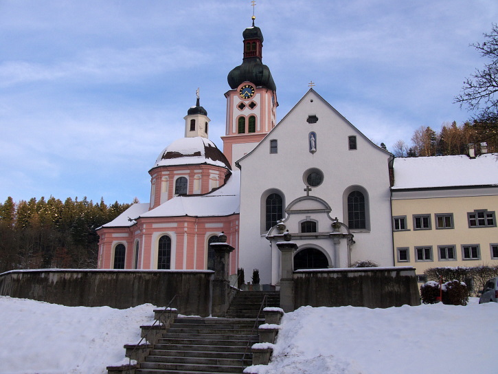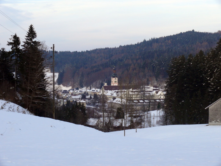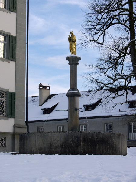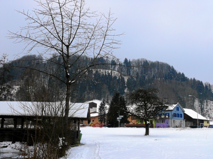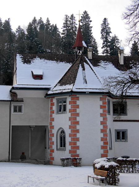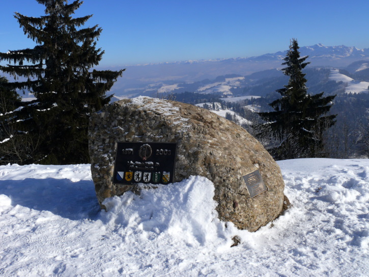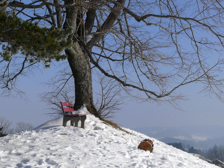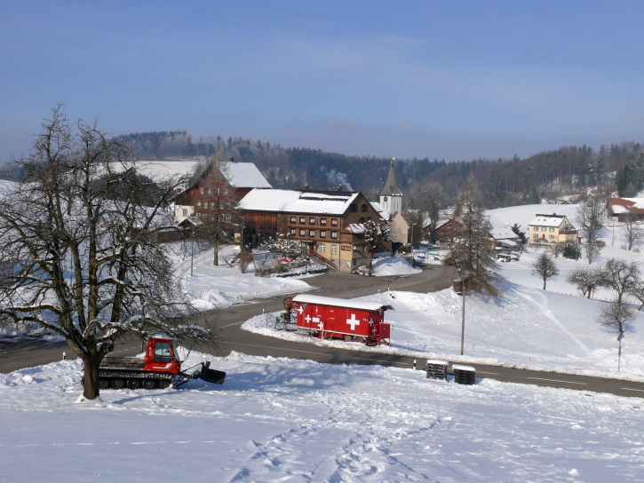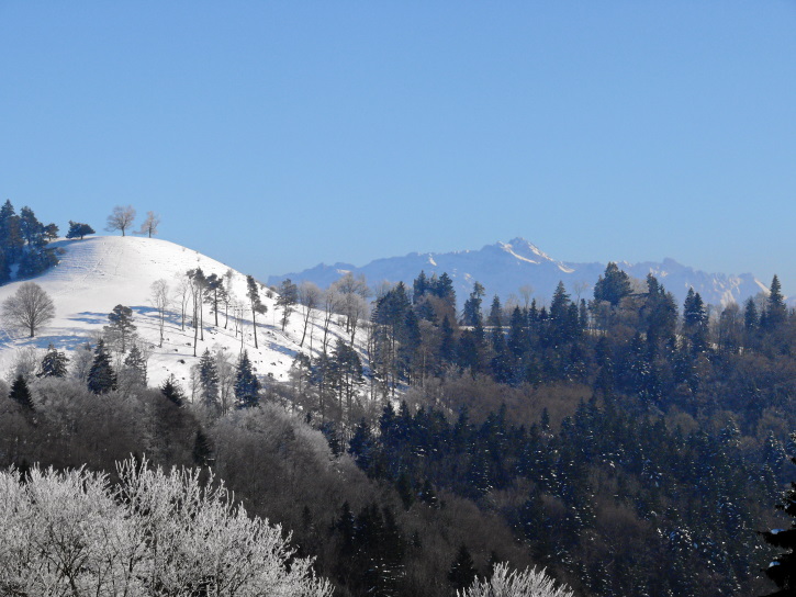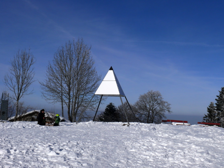 Wie vom Wetterbericht angekündigt, löst sich der Nebel langsam auf, aber es bleibt bitter kalt. Schon nach 2 Stunden bin ich oberhalb von Bäärlischwand am höchsten Punkt angelangt und entscheide mich angesichts des noch frühen Tages für eine Verlängerung mit dem in der Ferne sichtbaren Hörnli als zusätzlichem Tagesziel. Nach einer langen Durststrecke auf Asphalt (Züri-Oberland-Höhenweg) und einem kurzen, rutschigen Aufstieg stehe ich tatsächlich auf dem Gipfel des Hörnli, wo ein kräftiger Wind für noch frostigere Verhältnisse sorgt. Trotzdem speisen einige Gäste im Freien, die Hütte selbst ist an dem inzwischen sonnigen Wintertag hoffnungslos überfüllt. Viele fahren von dort mit einem der vielen Leihschlitten ab, für mich geht es aber zunächst auf dem gleichen Weg abwärts, am Dreiländerstein (Grenze der Kantone Thurgau, Zürich und St. Gallen) vorbei, aber beim Jakobsweg-Etappenort Allewinde zweige ich dann Richtung Fischingen ab. Dort könnte ich den höchsten Punkt des Thurgau (manche glauben, es ist der Dreibündenstein) in der Nähe von Groot "mitnehmen", aber um nochmals 100 m aufzusteigen, fehlen mir inzwischen einfach die Kräfte. So geht es durch den Wald, später vorbei an einer auf eine hohe Säule gesetzte Marienstatue und einer im Wald versteckten Idda-Kapelle hinunter in die Klostergemeinde und von dort an der Straße entlang (es gibt auch einen - deutlich ansteigenden - Wanderweg, der Fischingen und Dussnang verbindet) zurück nach Dussnang.