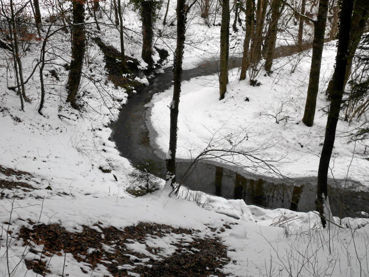 Kurz bevor der erwähnte Steilanstieg beginnt, biege ich ab in einen Fahrweg, der bald in einen Waldweg übergeht. Forstarbeiter bejahen zum Glück meine Frage, ob auch dieser Weg hinunter nach Fischingen führt. Kurz vor Hell stoße ich wieder auf den eigentlichen Wanderweg und lasse dann den finsteren Wald wieder hinter mir.