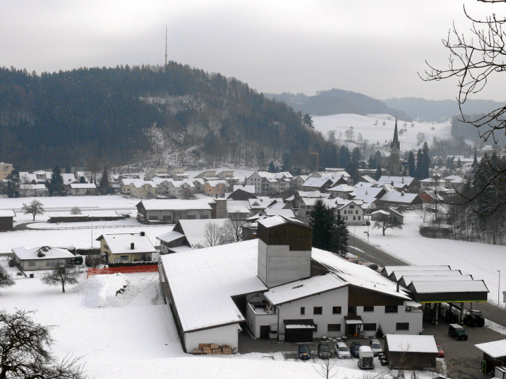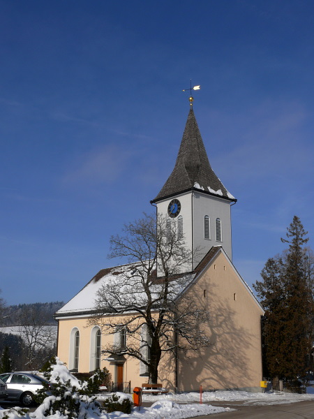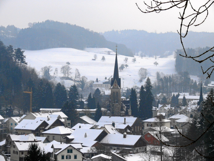 Blick auf Dussnang mit der reformierten Kreuzkirche
