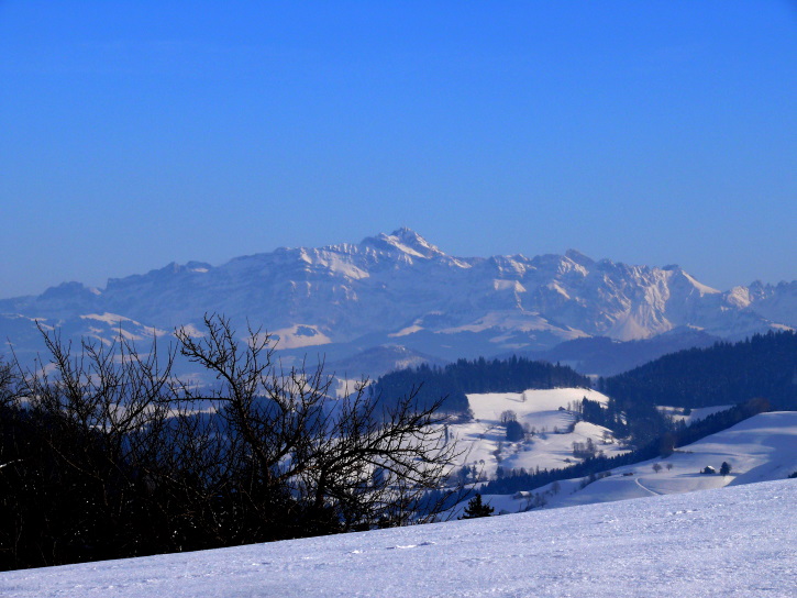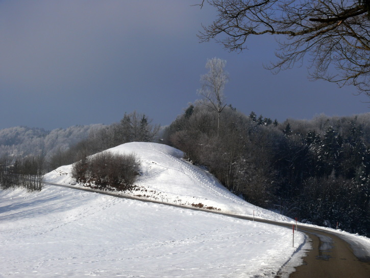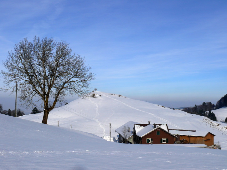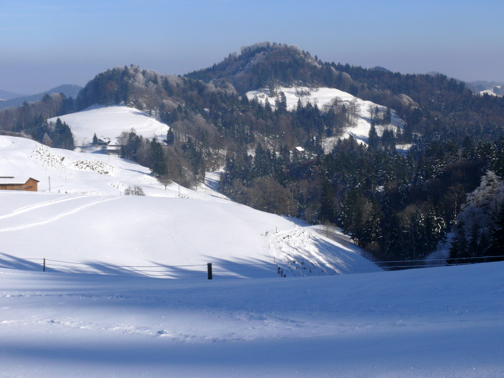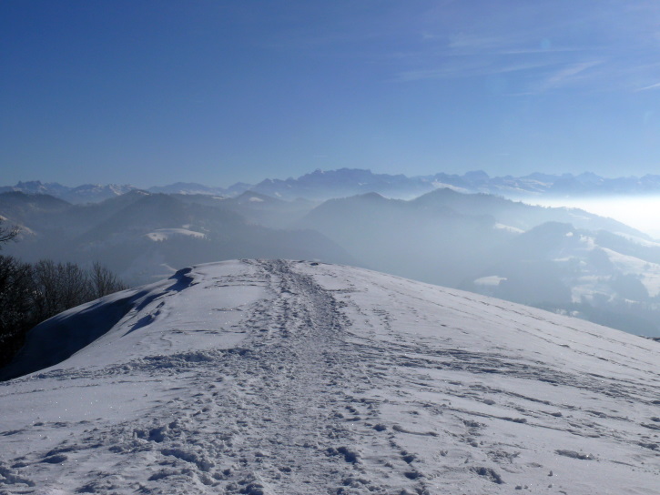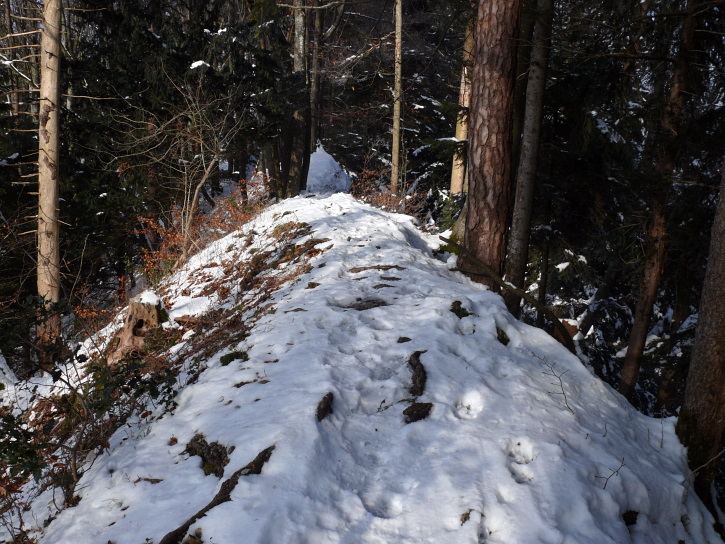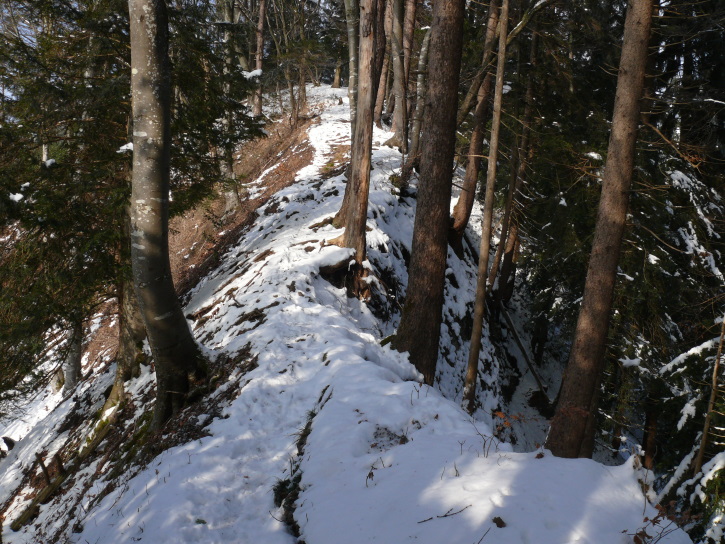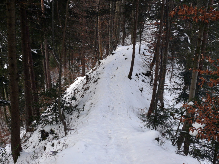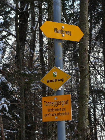Eigentlich wollte ich nach meiner Herbstbegehung nur testen, ob auch ein verschneiter Tanneggergrat noch problemlos zu überqueren ist. Von Dussnang ging es auf den nun schon bekannten Weg, der am Ortsende von Dussnang, an einem Mini-Weinberg vorbei, steil in die Höhe führt. Da selbst nach dem Warnschild ("Trittsicherheit und gutes Schuhwerk") auf dem markierten Bergweg noch einige Spuren von Mensch und Tier vorhanden waren, ging es frohgemut weiter, vorbei an der Ruine Tannegg und wenig später auf den doch teilweise schmalen Grat. Die Bedenken waren unbegründet - mit ein bisschen Vorsicht an einigen Passagen ist der Grat auch unter winterlichen Bedingungen leicht machbar.