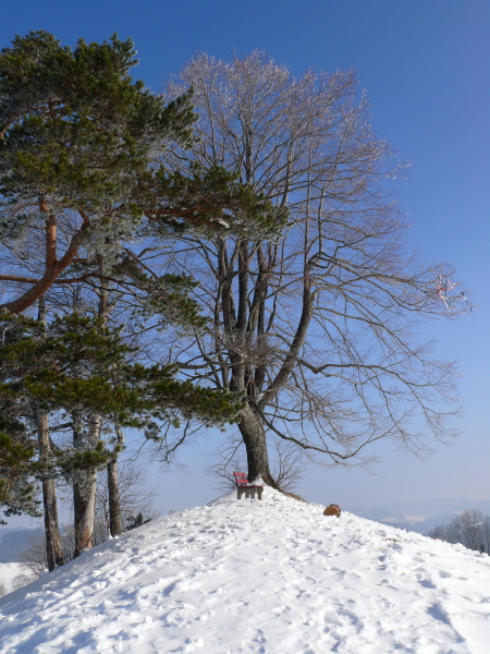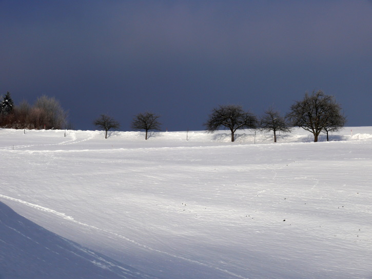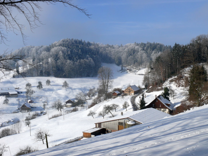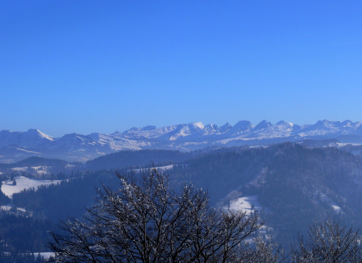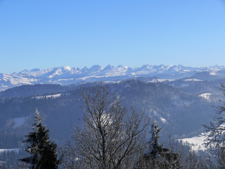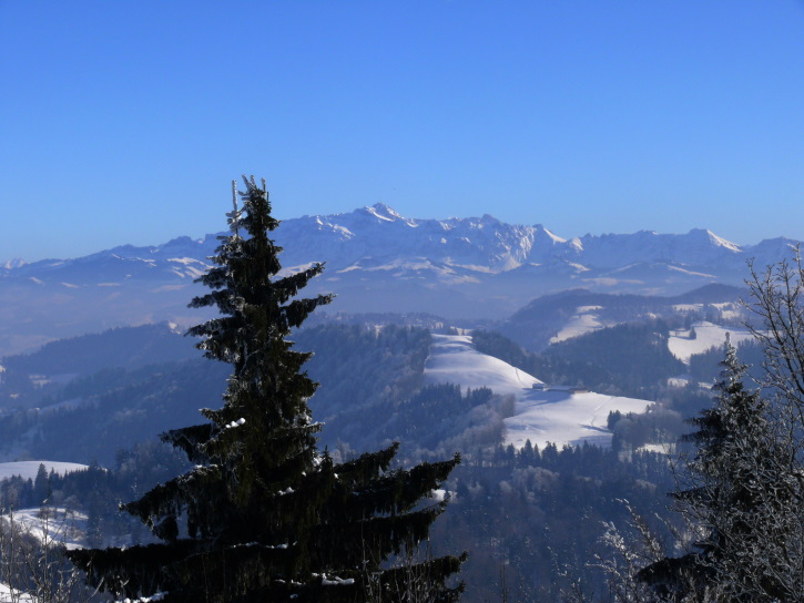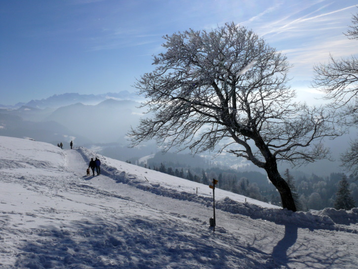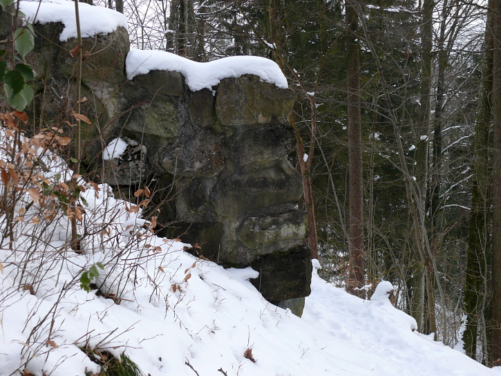 Eigentlich wollte ich nach meiner Herbstbegehung nur testen, ob auch ein verschneiter Tanneggergrat noch problemlos zu überqueren ist. Von Dussnang ging es auf den nun schon bekannten Weg, der am Ortsende von Dussnang, an einem Mini-Weinberg vorbei, steil in die Höhe führt. Da selbst nach dem Warnschild ("Trittsicherheit und gutes Schuhwerk") auf dem markierten Bergweg noch einige Spuren von Mensch und Tier vorhanden waren, ging es frohgemut weiter, vorbei an der Ruine Tannegg und wenig später auf den doch teilweise schmalen Grat. Die Bedenken waren unbegründet - mit ein bisschen Vorsicht an einigen Passagen ist der Grat auch unter winterlichen Bedingungen leicht machbar.