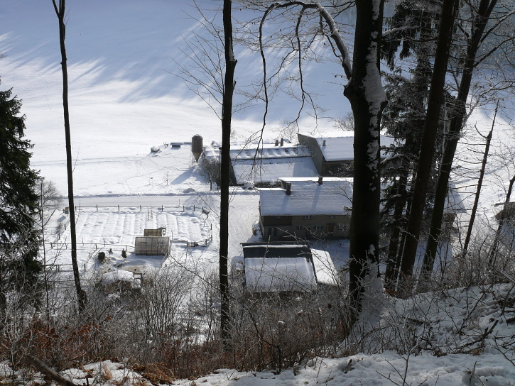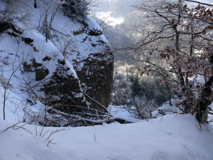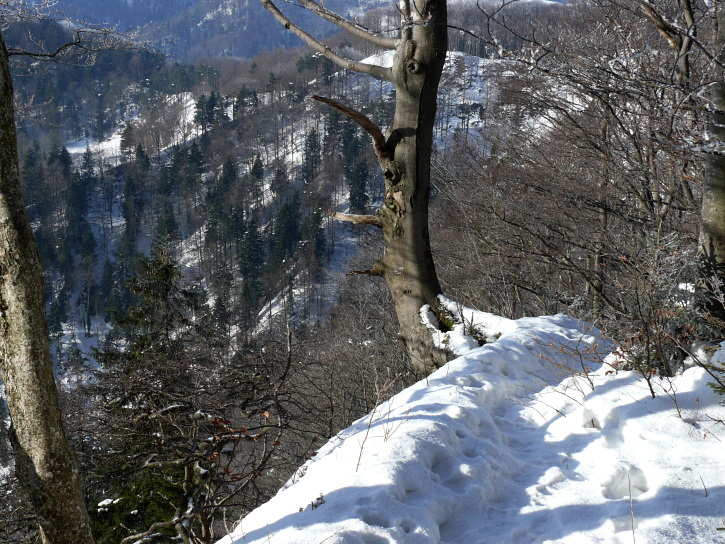 Nachdem es aufgrund des Andrangs unmöglich erschien, ein Plätzchen im warmen Gasthaus zu ergattern, geht es wieder an den Abstieg, um nicht gänzlich auszukühlen. Neben dem offiziellen Weg verläuft ein Schnellabstiegsweg an der Geländekante entlang. Im tiefen Schnee ist man zwar nicht schneller unten, aber der Wegverlauf ist deutlich aufregender und anspruchsvoller.