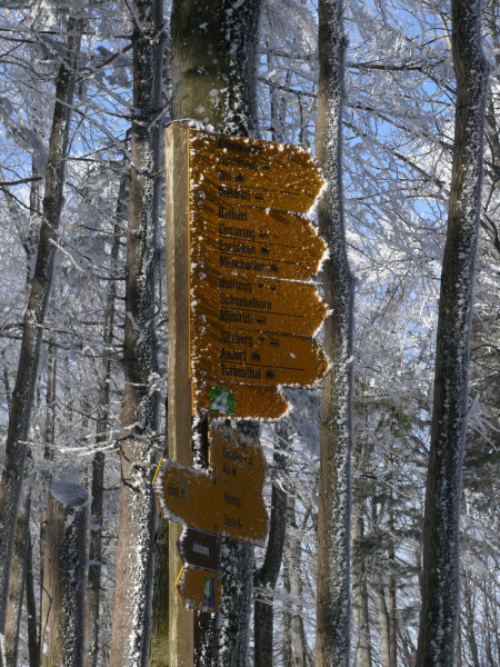 Die Wegweiser sind an diesem Tag auf dieser Höhe wegen Vereisung kaum zu entziffern